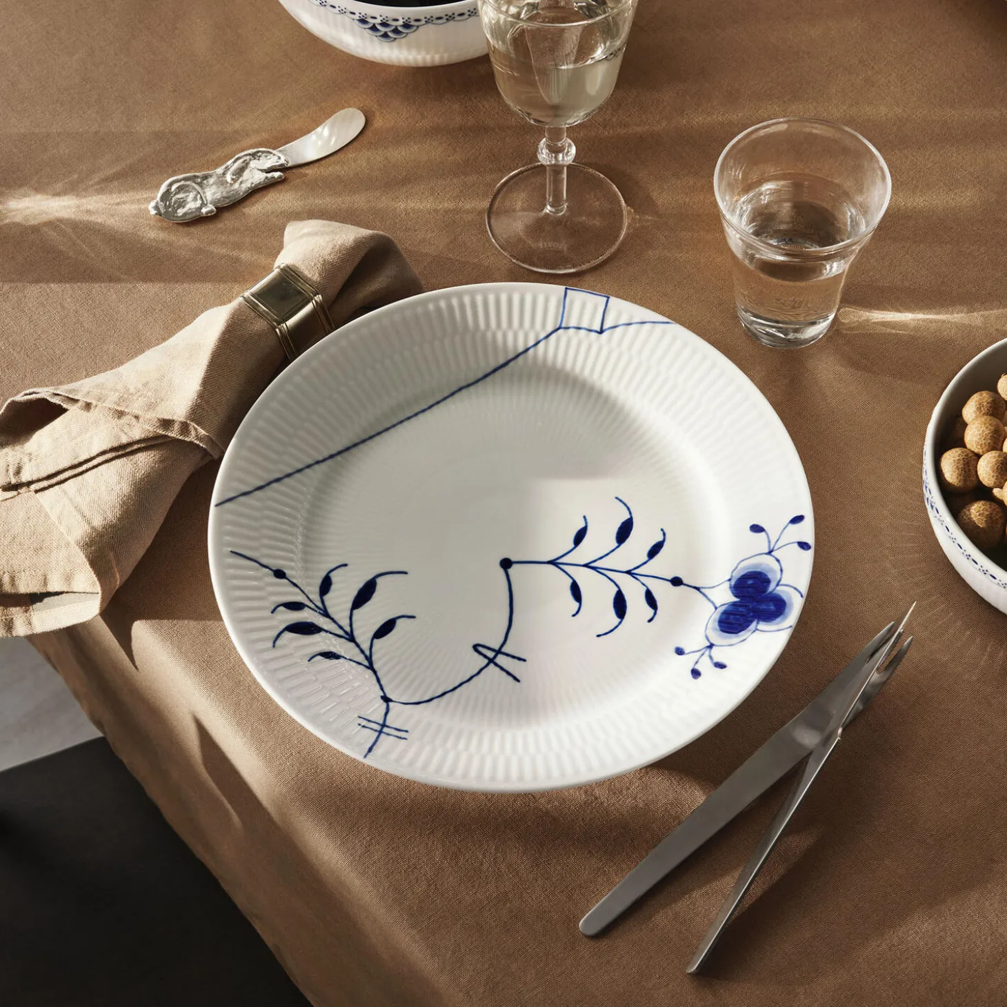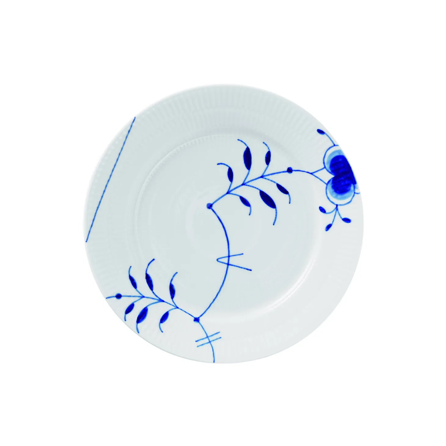 Blå Mega Riflet frokosttallerken i porcelæn fra Royal Copenhagen. Dekoration #9. Farve: hvid/blå. Mål: Ø 22 cm. Design: Karen Kjældgård-Larsen.