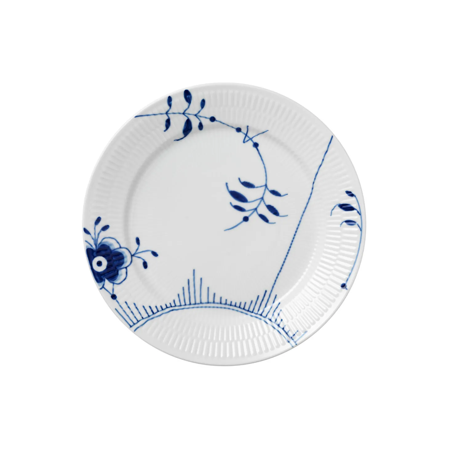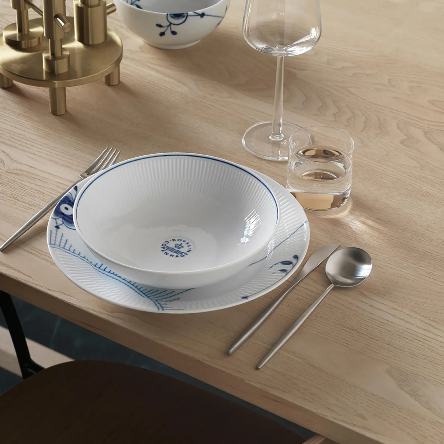 Blå Mega Riflet middagstallerken i porcelæn fra Royal Copenhagen. Dekoration #2. Farve: hvid/blå. Mål: Ø 27 cm. Design: Karen Kjældgård-Larsen.