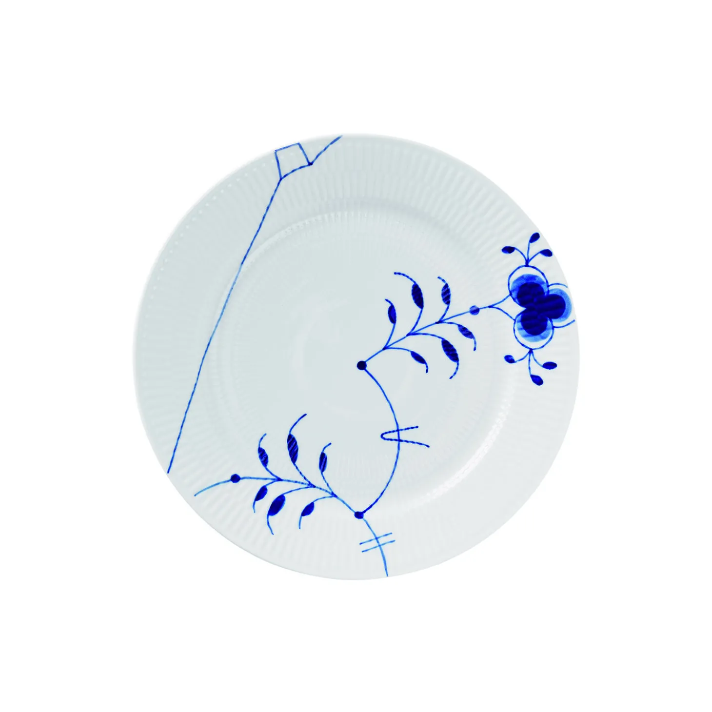 Blå Mega Riflet middagstallerken i porcelæn fra Royal Copenhagen. Dekoration #9. Farve: hvid/blå. Mål: Ø 27 cm. Design: Karen Kjældgård-Larsen.