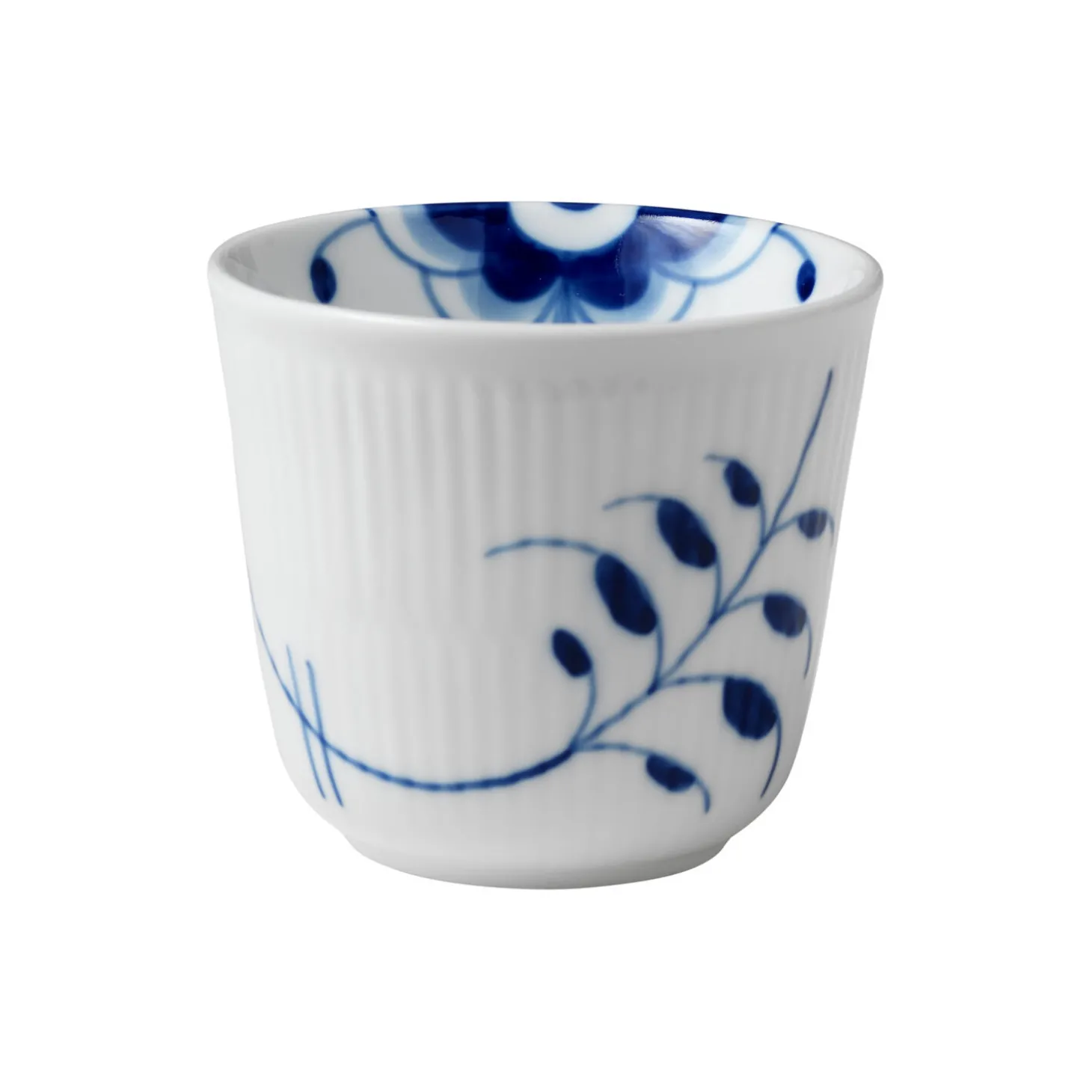 Blå Mega Riflet termokop i porcelæn fra Royal Copenhagen. På denne Blå Mega Riflet Termokop på 26 cl blomstrer en forstørret, håndmalet krysantemum, hvorfra en palmette udspringer og slynger sig langs koppen i et overraskende udtryk. Koppens indre og ydre lag former et hulrum, der hindrer koppen i at lede varme til ydersiden. Den lille størrelse er perfekt både som kaffekop og tekop.