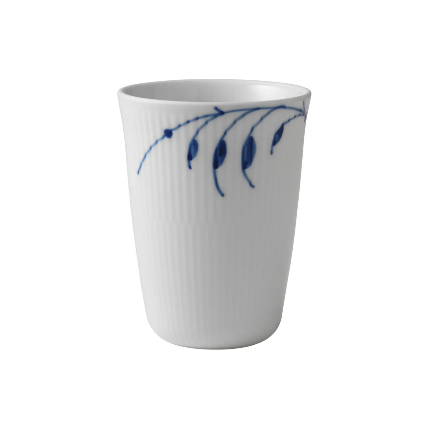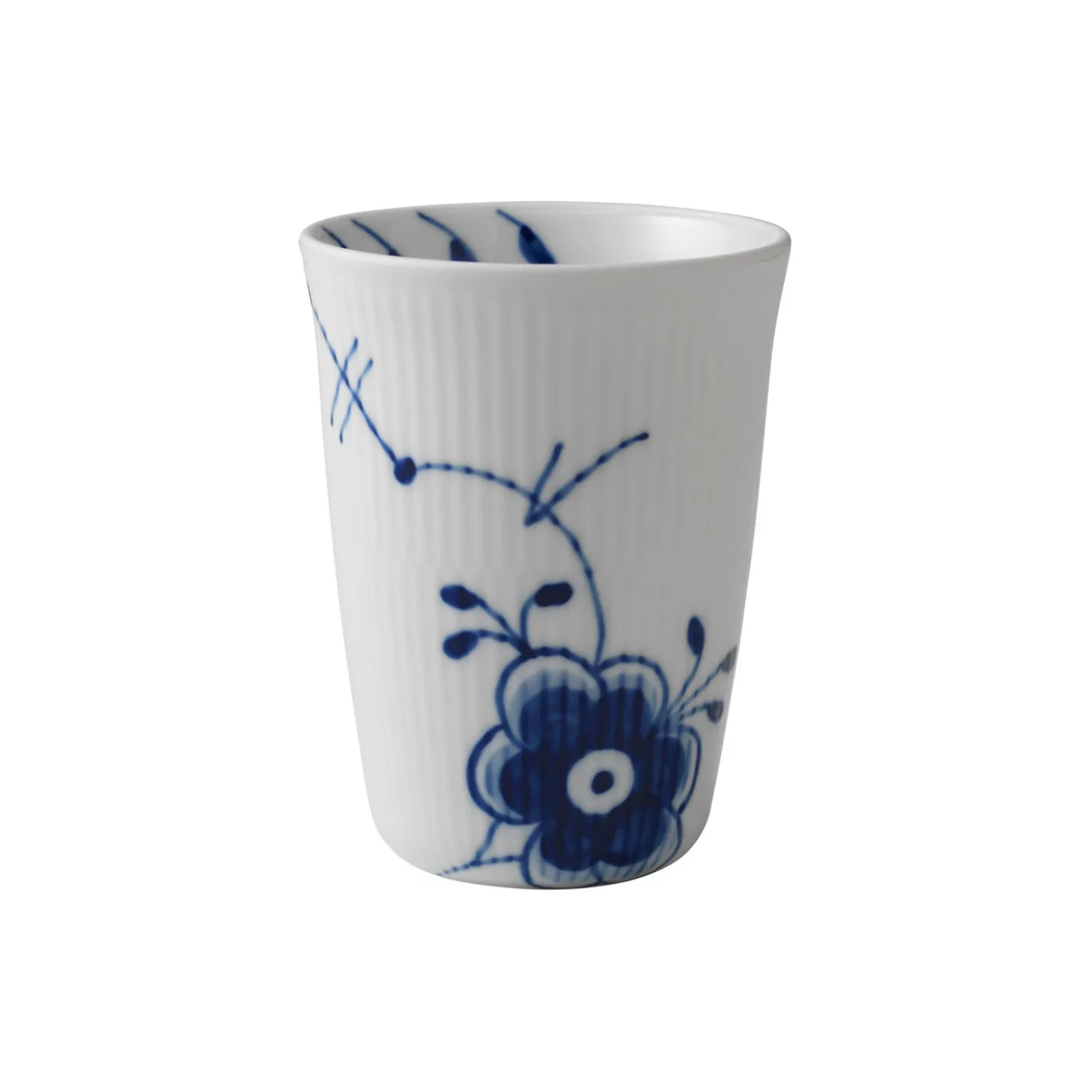 Blå Mega Riflet termokop i porcelæn fra Royal Copenhagen. På termokoppens ene side blomstrer en håndmalet krysantemum i fuldt flor, mens en palmette udspringer fra blomsten og smyger sig rundt om koppen i et kontemporært udtryk. Termokoppen på 39 cl i Blå Mega Riflet har et indre og ydre lag, som danner et hulrum, der hindrer koppen i at lede varme til ydersiden. Den store størrelse giver plads til mælkeskum på toppen af dine varme drikke.