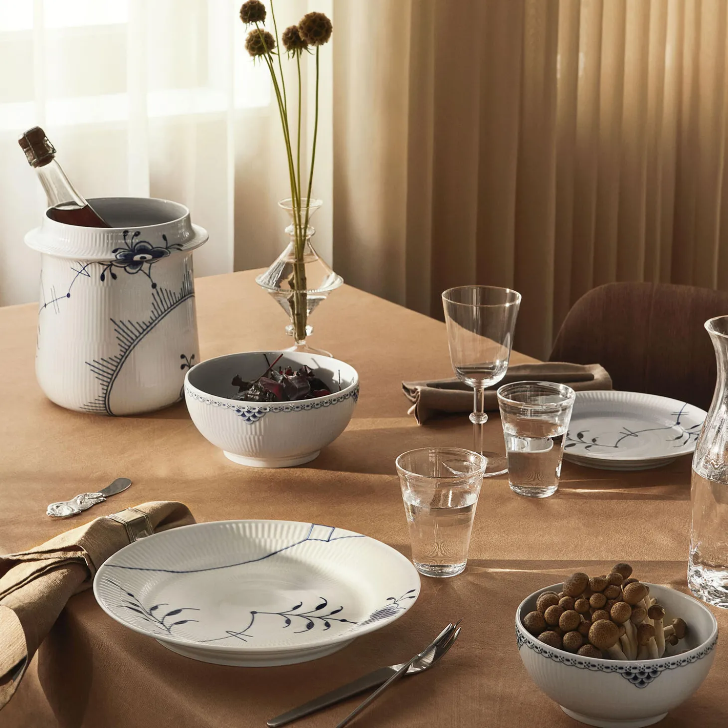 Blå Mega Riflet vinkøler er en opdateret version af den klassiske vinkøler, designet til at holde din champagne eller vin kølig ved bordet. Det strømlinede design står i smuk kontrast til den grafiske dekoration fra Blå Mega Riflet, og den fremtrædende kant fungerer både som en stilfuld accent og et praktisk håndtag.