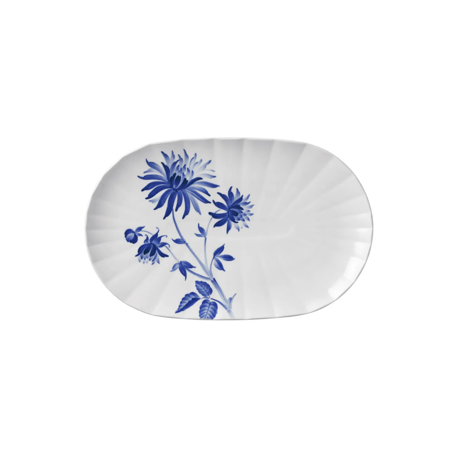 Blomst fad i håndmalet porcelæn med dahlia motiv fra Royal Copenhagen. Det store blomst Fad på 34 cm har geometriske vinkler, som åbner sig op som en vifte og afslører den håndmalede dahlia, der i al sin pragt blomstrer på det hvide porcelæn. Det ovale fad skaber en særlig bordækning som et serveringsfad til store og små retter.