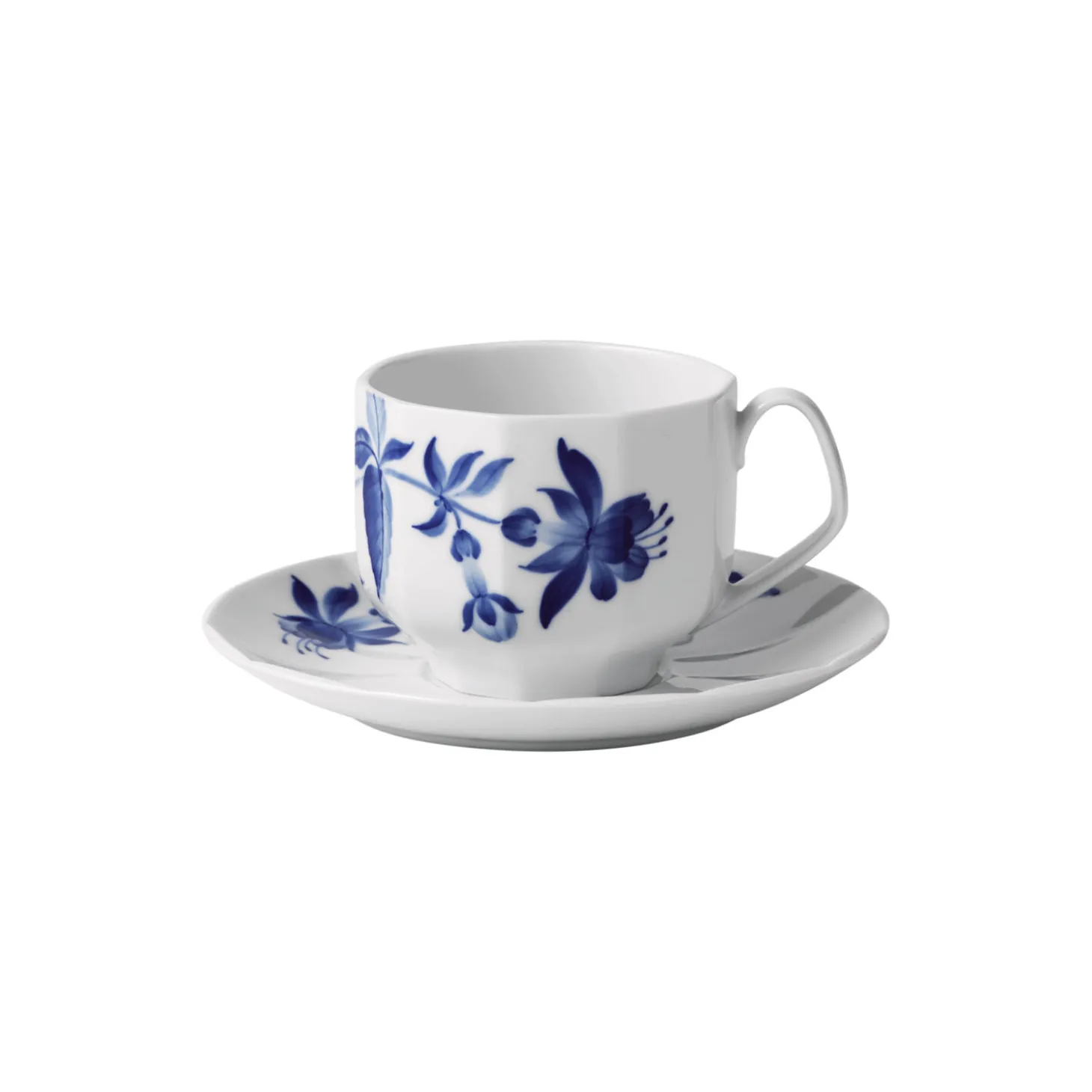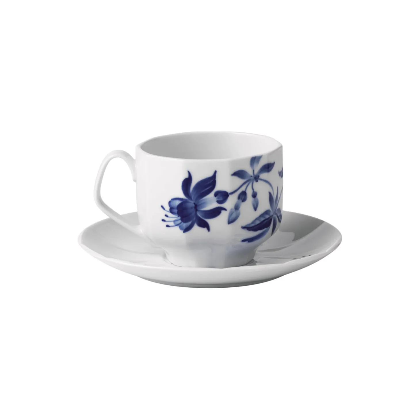 Blomst kop med underkop i porcelæn med fuchsia motiv fra Royal Copenhagen. Koppen og underkoppen fra blomst-stellet er dekoreret med en håndmalet fuchsia, der yndefuldt spreder sine eksotiske blomster på det hvide porcelæn. Koppen på 22 cl står på en lav søjlefod, som løfter det elegante design, der komplimenteres af den kantede hank. Brug koppen som kaffekop eller tekop.