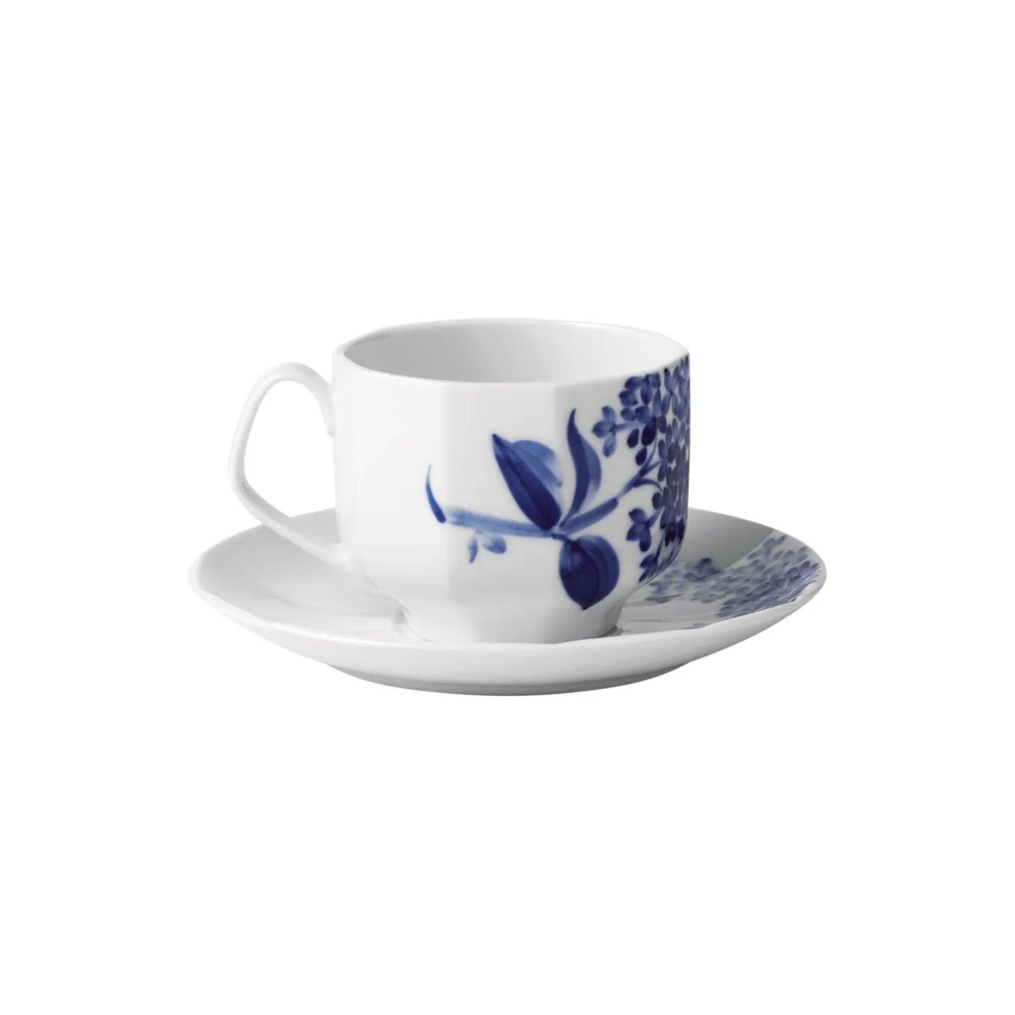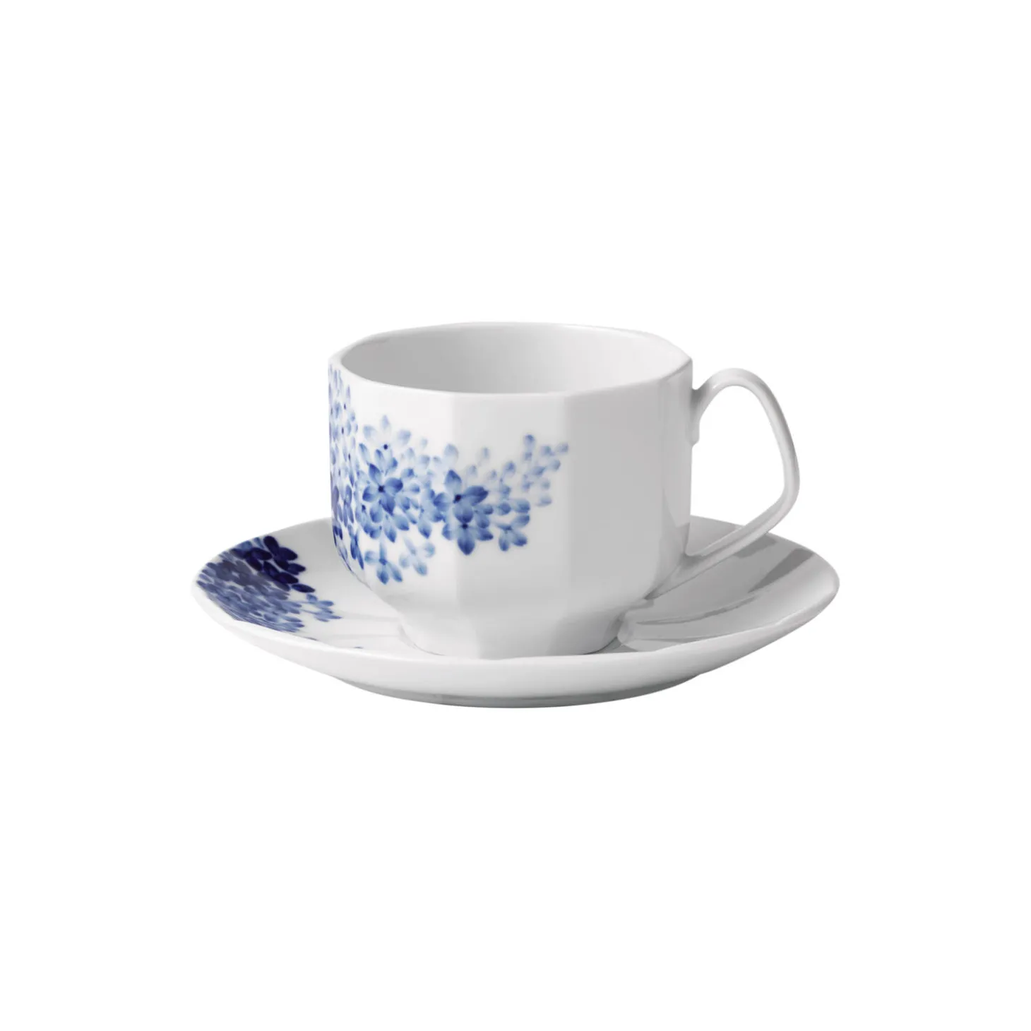 Blomst kop med underkop i porcelæn med syren motiv fra Royal Copenhagen. Denne blomst kop er dekoreret med en håndmalet syren, som gavmildt lader sine små blomsterstande vokse ned på underkoppen og fornøjer med sin store detaljerigdom. Koppen på 22 cl er særligt egnet som kaffekop, og den kantede hank komplimenterer koppens lette design.