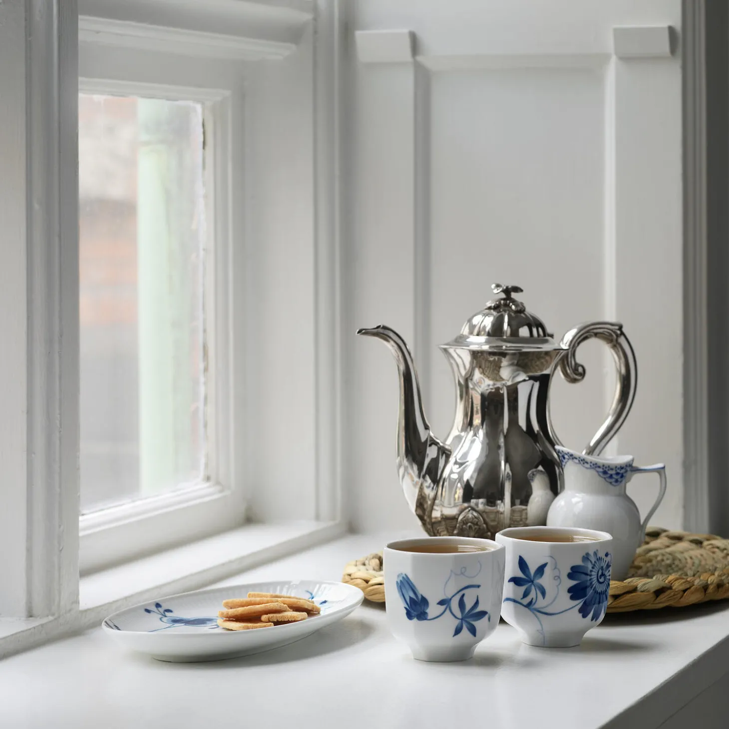 Blomst multikop i porcelæn fra Royal Copenhagen. Nu føjes to nye kopper til blomst. Deres nette størrelse gør dem behagelige at holde om og velegnede til den elegante teservering eller en delikat espresso macchiato. De håndmalede dekorationer afbilder passionsblomsten i to livsfaser: Som knop på den ene kop og som blomst på den anden. Kopperne kommer som et sæt – én smuk blomsterfortælling.