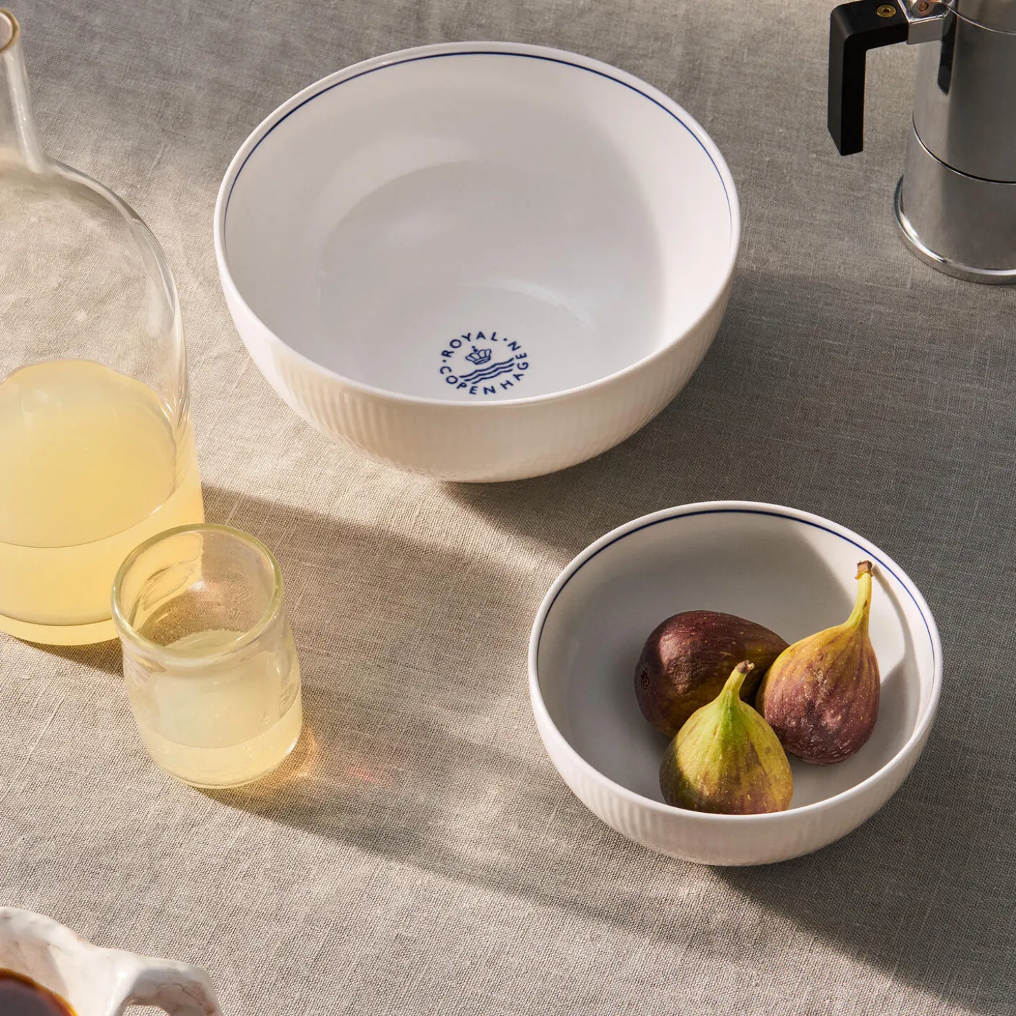 Der er et element af landlig charme til Blueline-kollektionen. Det hvide riflede porcelæn er dekoreret med en enkelt blå streg på kanten af hvert stykke, og et håndstemplet Royal Copenhagen logo pryder en forsænket del af overfladen. Den store Blueline skål er perfekt til servering af salater eller til at opbevare frugt og grønt på køkkenbordet.