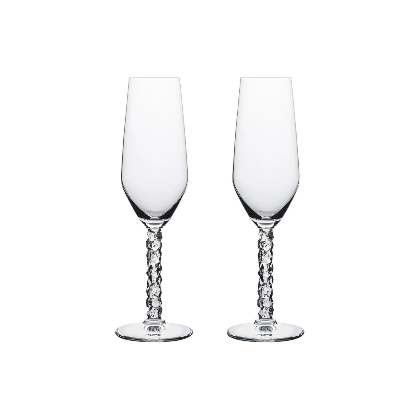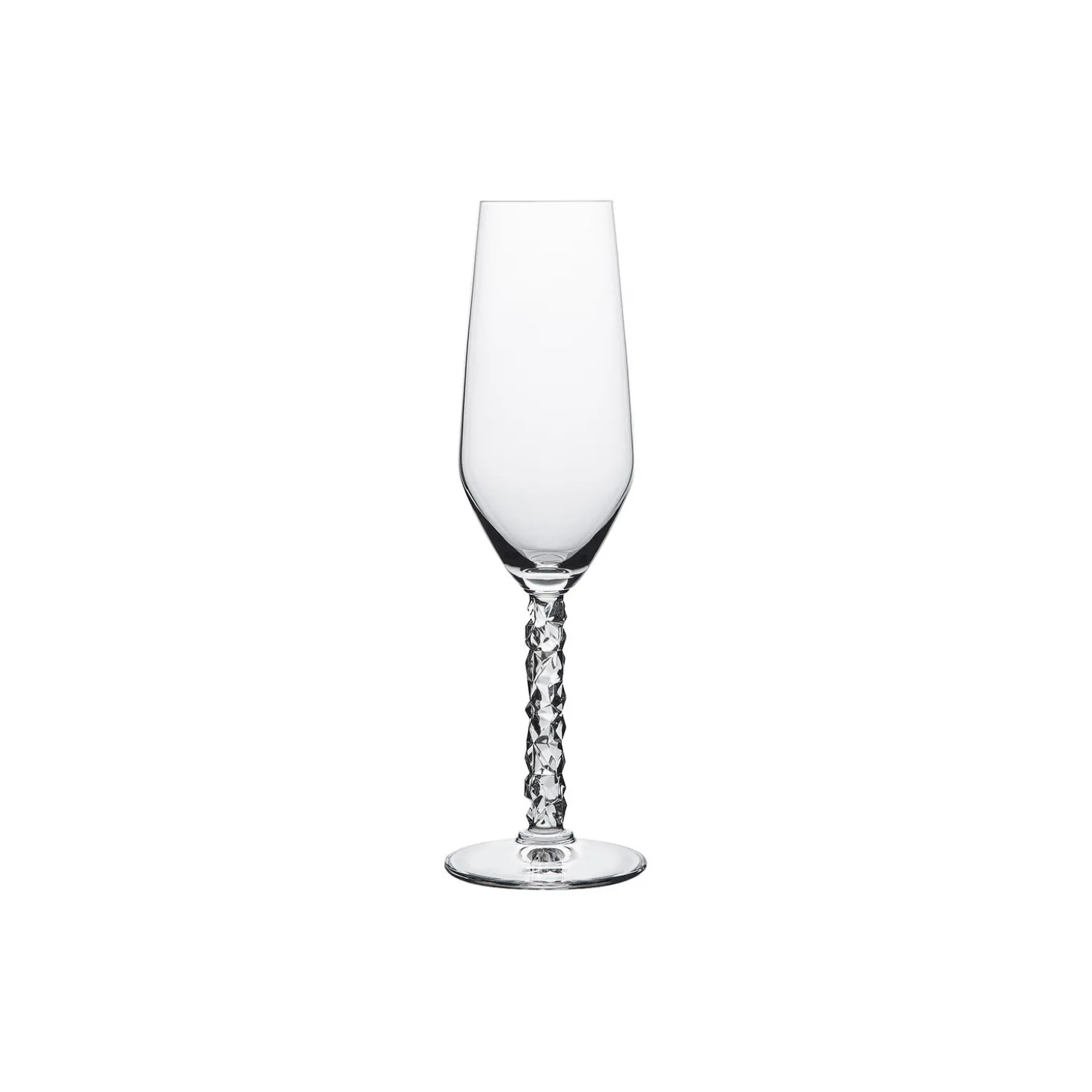 The Carat collection is based on a contemporary interpretation of the traditional cut glass for which Orrefors is world-renowned. The irregular geometry produces beautiful reflections of light in the crystal. Carat Champagne is a glass for sparkling drinks. The stem of the glass is covered in the collection’s characteristic pattern. Designed by Lena Bergström.