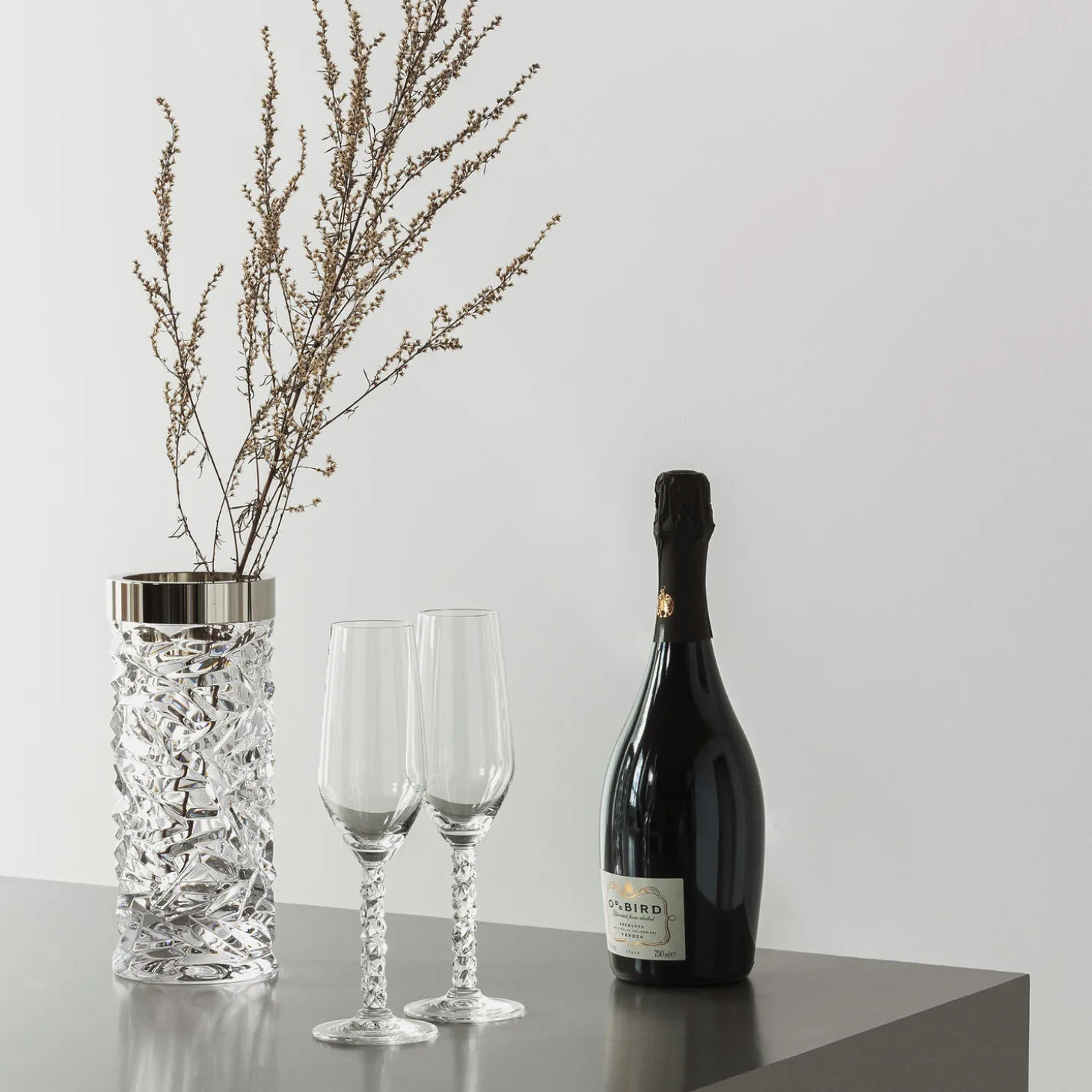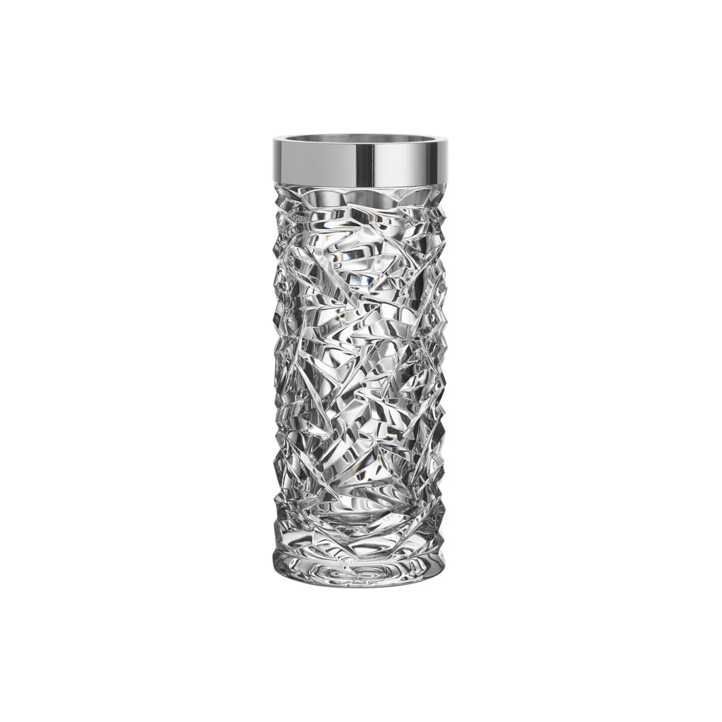 The Carat collection is based on a contemporary interpretation of the traditional cut glass for which Orrefors is world-renowned. The irregular geometry produces beautiful reflections of light in the crystal. This cylinder vase, with a metal top edge, is suitable for flowers or plants from the garden. Designed by Lena Bergström.