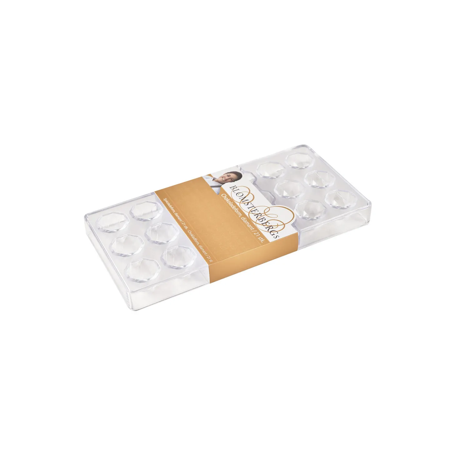 Professionel chokoladeform i hård plast til fremstilling af hjemmelavede, støbte chokolader. Formen tåler ikke fryser eller ovn, og er ikke egnet til opvaskemaskine. Rengør i stedet formen i varmt vand uden brug af sæbe, for at undgå at chokoladen hænger fast. Tør efter med viskestykke og derefter med vat for at sikre, at alle rester bliver fjernet fra rillerne. Poler evt. også formen med vat før brug.