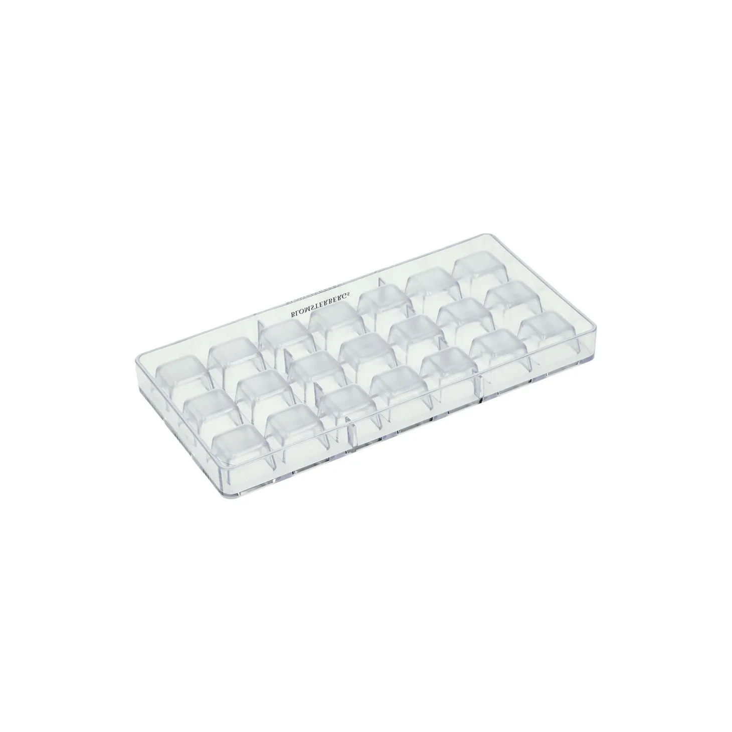 Professionel chokoladeform i hård plast til fremstilling af hjemmelavede, støbte og fyldte chokolader. Formen tåler ikke fryser eller ovn, og er ikke egnet til opvaskemaskine. Rengør i stedet formen i varmt vand uden brug af sæbe, for at undgå at chokoladen hænger fast. Tør efter med viskestykke og derefter med vat for at sikre, at alle rester bliver fjernet fra rillerne. Poler evt. også formen med vat før brug.