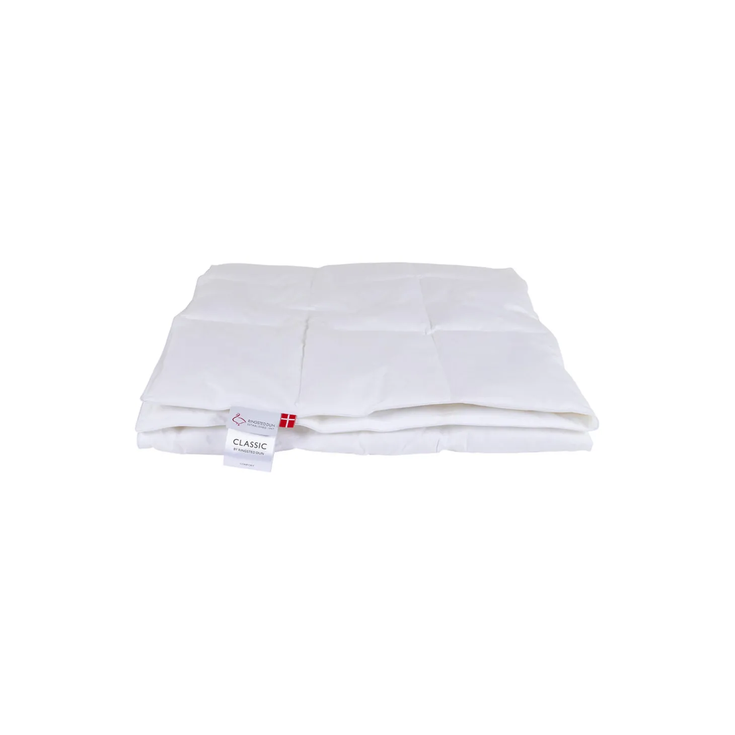 Classic Comfort ekstra sval sommerdyne med andedun og småfjer og vår i 100% bomuldscambric fra Ringsted Dun. Farve: hvid. Mål: 140×200 cm. Fyldmængde: 240 g. Bæreevne over 9.