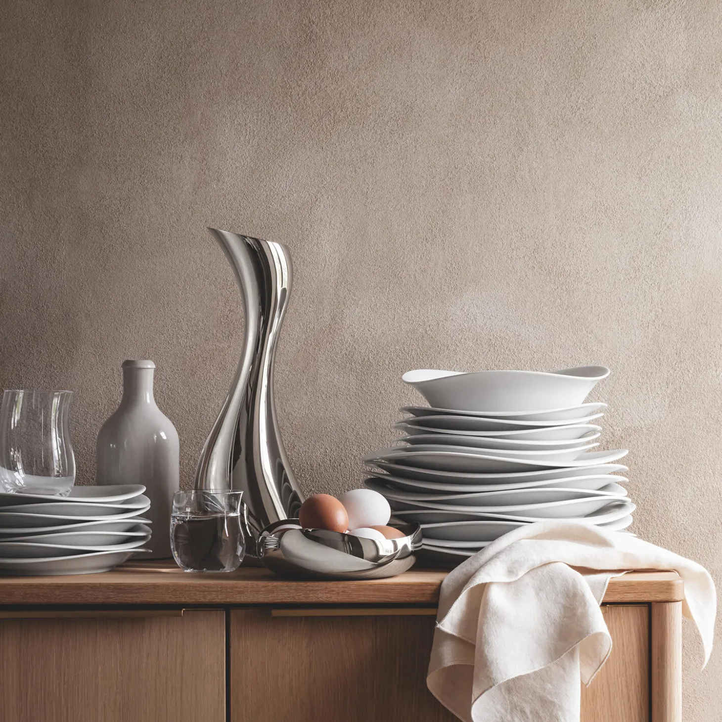 Cobra serveringsskålen vækker opsigt med sine skulpturelle og flydende linjer i blankt rustfrit stål, som fuldender borddækningen med et strejf af moderne elegance. Skålen indbyder til servering af salat, ris eller grøntsager og præsenterer maden med stil for dine gæster. Brug den smukke serveringsskål alene eller i kombination med andre Cobra skåle i forskellige størrelser.