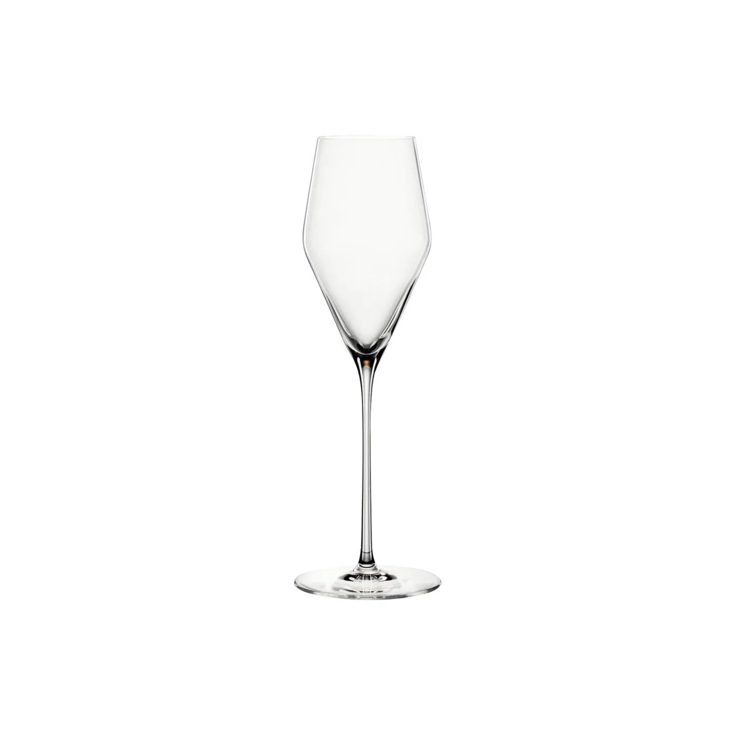 The Champagne glass is perfect for developing and displaying champagne’s complex characteristics. This glass allows a wide range of aromatics to unfold. Unlike a slim flute, the design allows the complex layers to grow, intensify and be released in a way that is not achieved with a narrow glass. The glass also includes a ‘sparkling point’ to aid the formation of the Champagne bubbles.