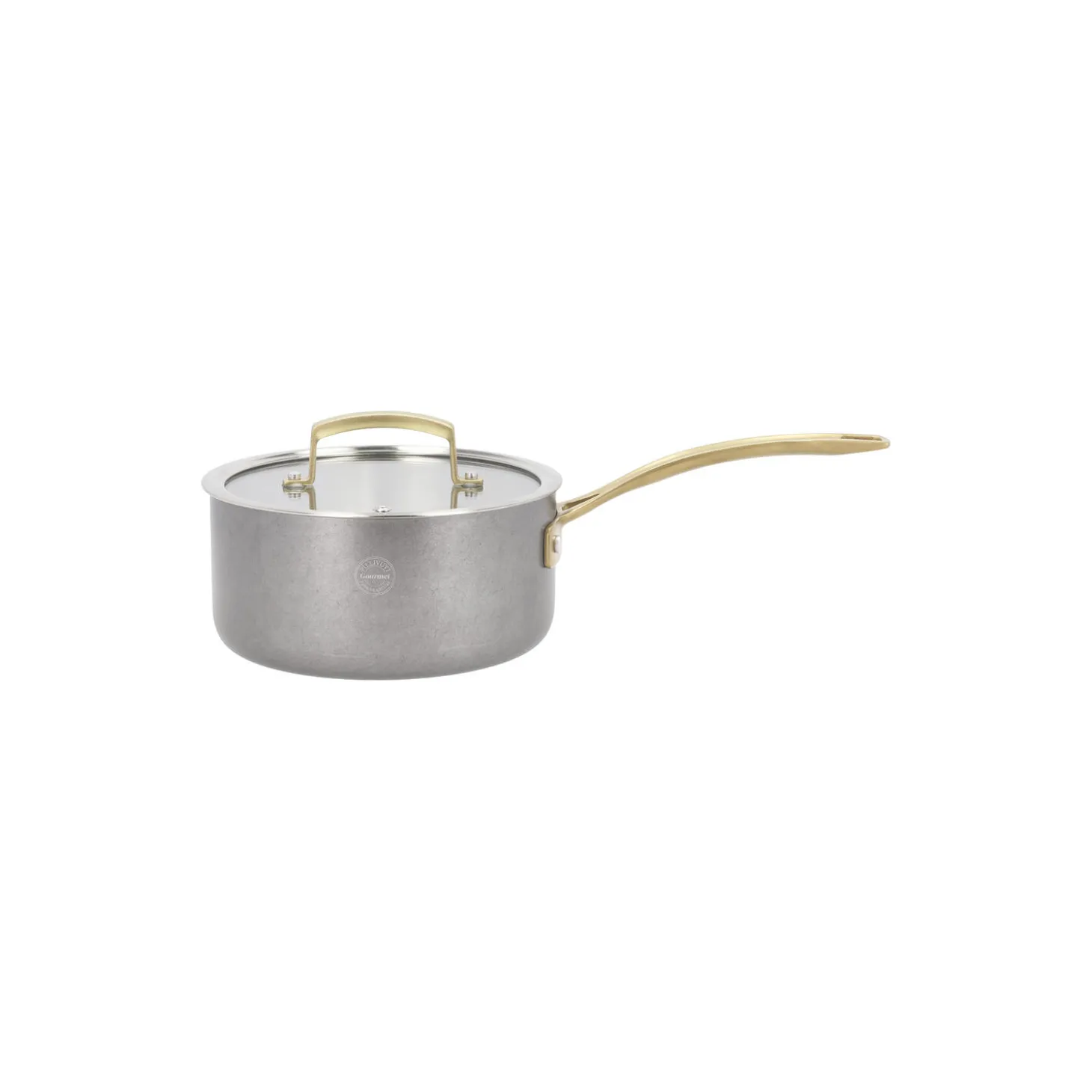 Fremstillet af 18/10 rustfrit stål med en kraftig 2,5 mm 3-lags konstruktion af rustfrit stål, aluminium og rustfrit stål. Mellemlaget af aluminium sikrer optimal varmefordeling. Pånittede støbte stålhåndtag, som er PVD-forgyldt. Ydersiden har en vintage polering. Glaslåg med damphul. Målestreger indvendigt på kasseroller og gryder. Passer til alle varmekilder inkl. induktion. Håndopvask anbefales.