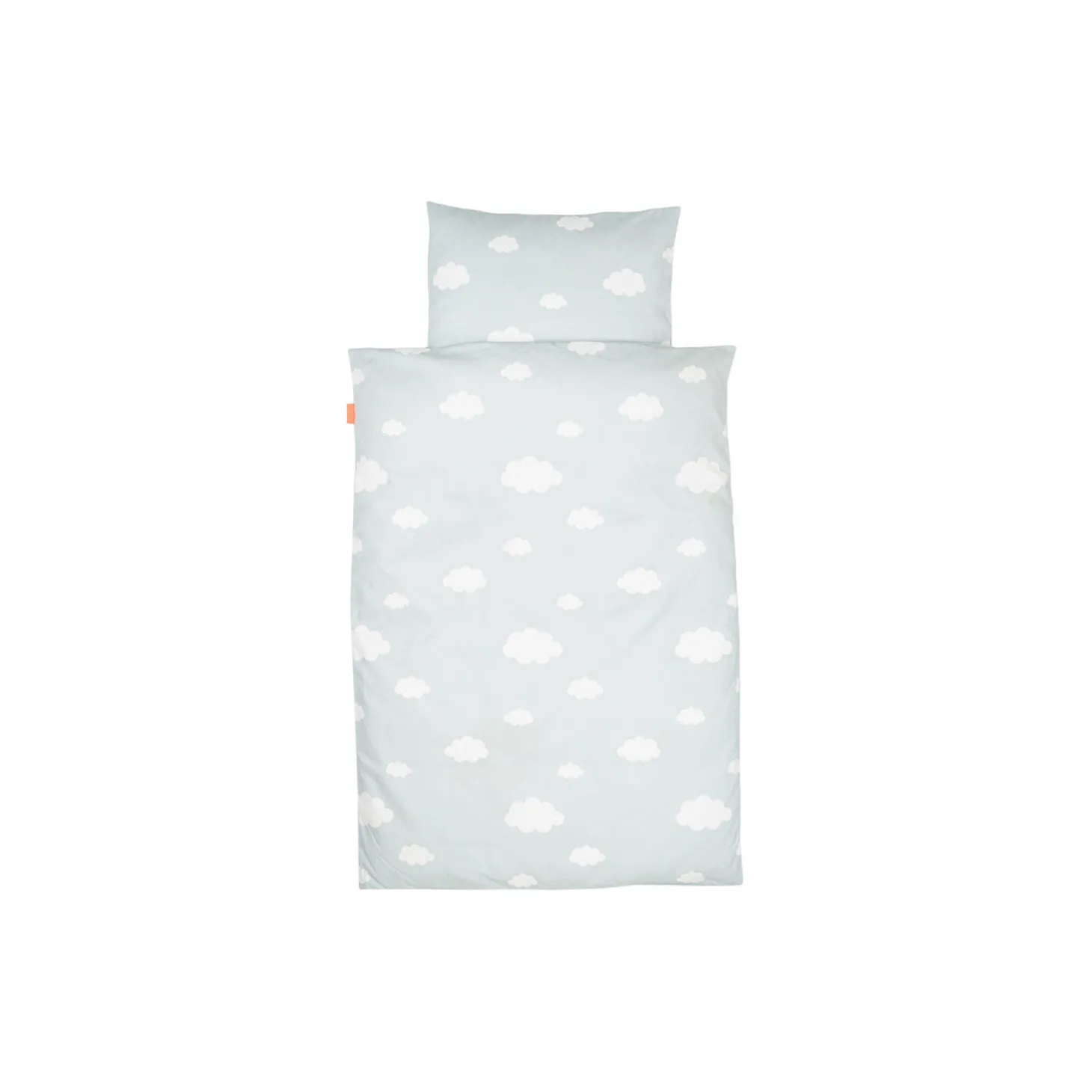 • Fin blåt babysengesæt dekoreret med Elphee, Birdee, skyer og en ballon • Pakket i en lille stofpose, der matcher sengetøjet, og som kan bruges til legetøj, et sæt skiftetøj, sko eller andre praktiske formål • Praktisk YKK-sikkerhedslynlås i både pude- og dynebetræk