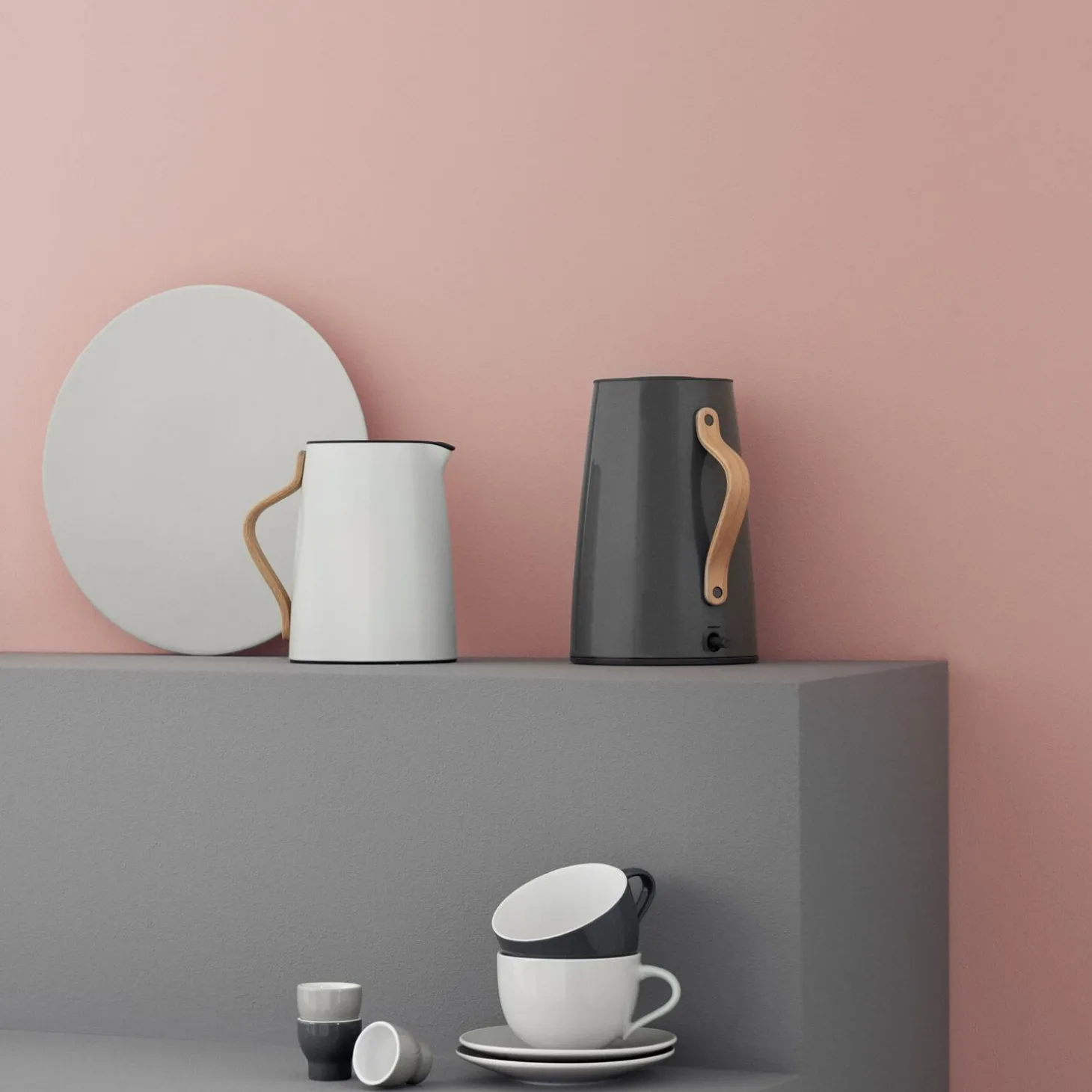 Forskøn hverdagen med Emma – Steltons prisvindende te- og kaffeserie. Emma elkedlen er en æstetisk, flot stålkande med rene linjer, der i mørk grå matcher resten af seriens tone-i-tone nuancer. Det formspændte bøgehåndtag giver elkedlen et distinkt nordisk udtryk. Den ledningsfri elkedel kan rumme 1,2 L. og er forsynet med udtageligt kalkfilter, tørkogningssikring og automatisk slukning ved kogepunktet.