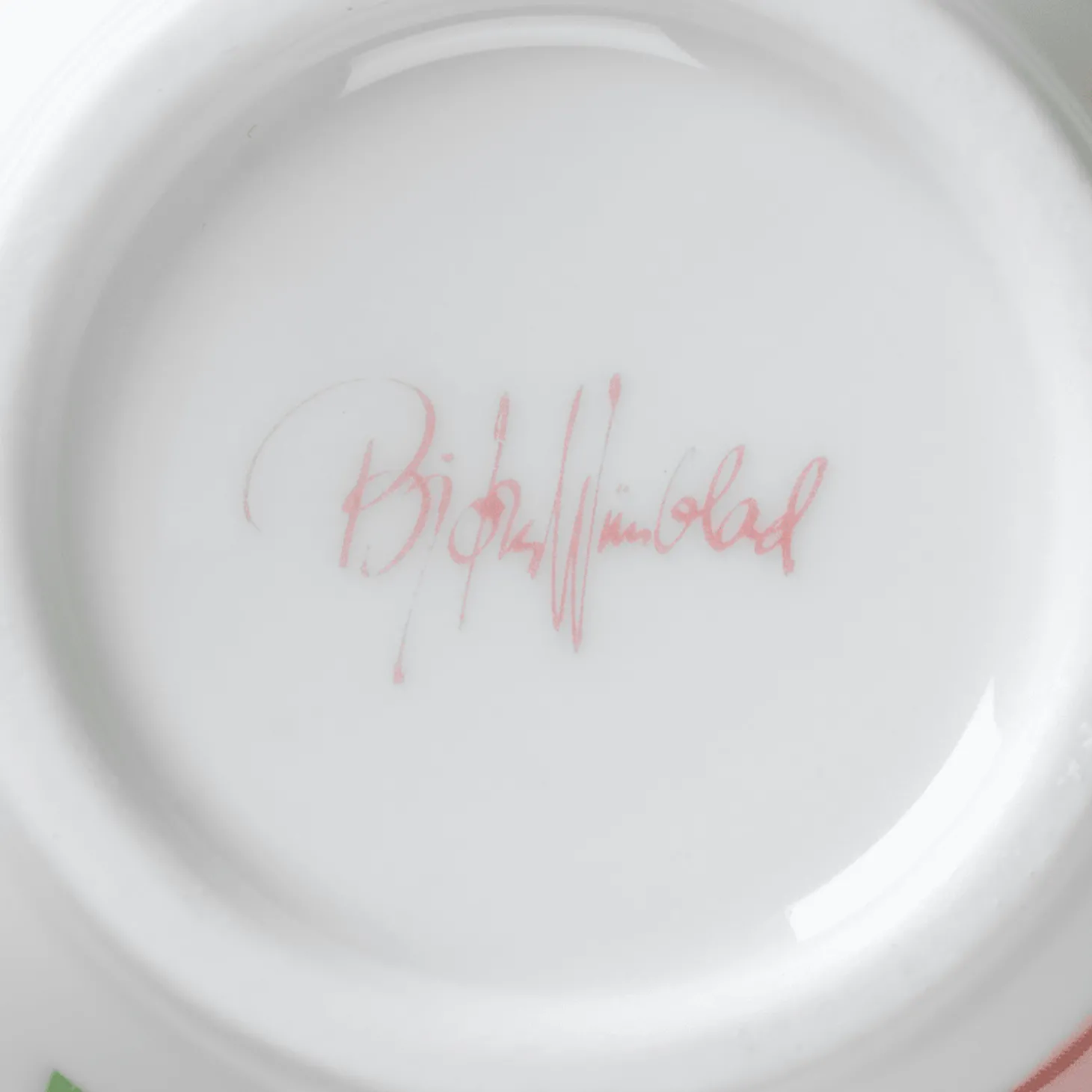 Bjørn Wiinblads univers er alt andet end minimalistisk. Det er overdådigt, skævt, vidunderligt – og i høj grad defineret af livlige farver og en unik stil. Du finder også hans mange finurlige og kunstneriske dekorationer på krus, hvor farverige, geometriske former med et håndtegnet præg blandes på kryds og tværs og alligevel fungerer forrygende sammen. Eva-kruset i rosa har snoede striber i pink hele vejen rundt indrammet af lodrette grønne striber og gule prikker. Mønsteret er inspireret af Eva-vasens forskellige kjoler, og farverne er holdt i de samme delikate nuancer, der kendetegner Evas glade og venlige univers. Kruset rummer 35 cl – perfekt til en god kop kaffe eller te. Det kan roligt vaskes i opvaskemaskinen, når der er sjovere ting i livet end at vaske op i hånden. Hver enkelt krus har sin helt egen personlighed og farvepalette, men har stadig et tydeligt familieskab i kraft af Bjørn Wiinblads genkendelige streg. Eva-kruset pynter og skaber glæde både på bordet og på hylden, hvor det lyser op og gør hverdagen lidt mere farverig – præcis som Bjørn Wiinblad elskede det.