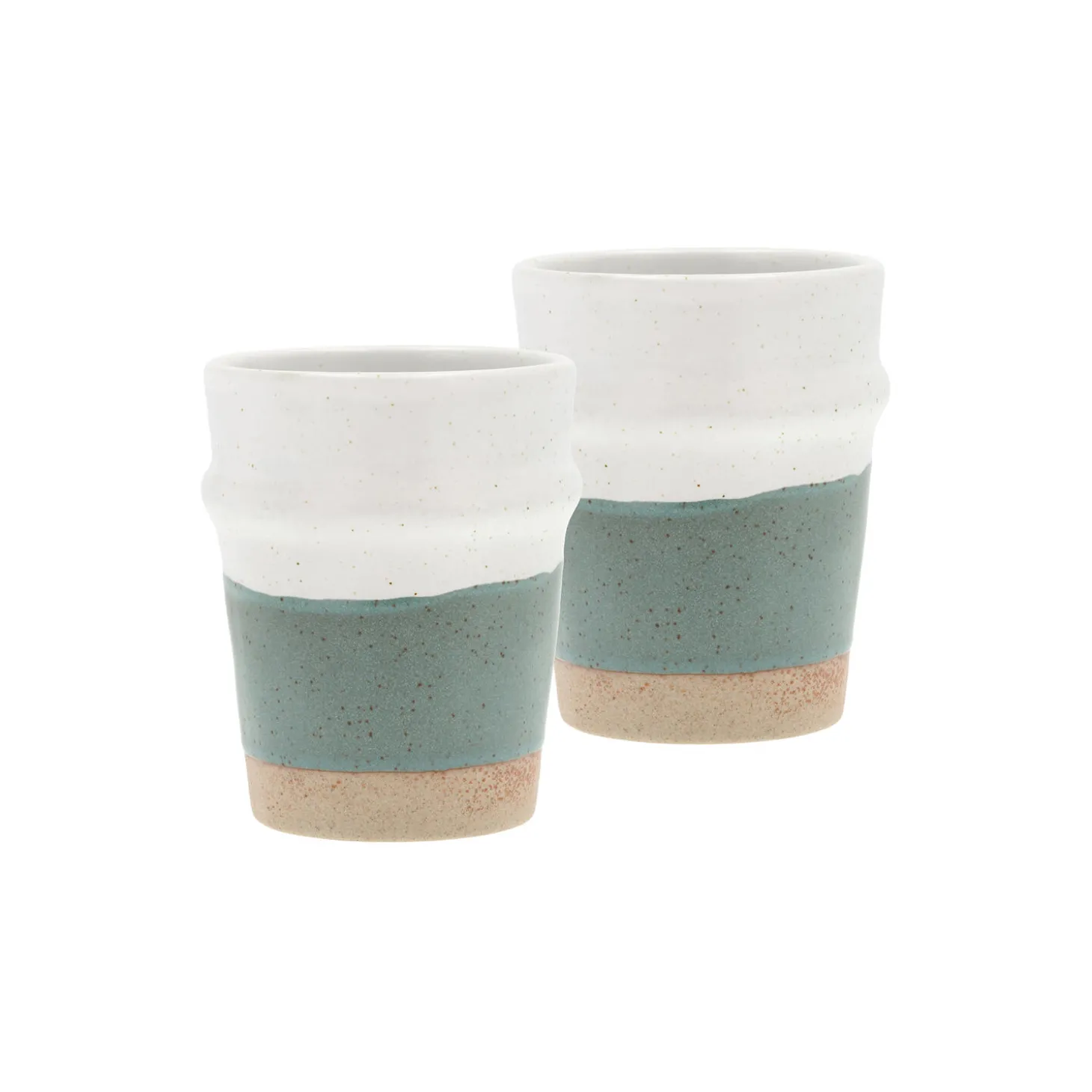 2 porcelænskrus, 35 cl, med en smuk, reaktiv glasur. De har et fantastisk udseende med en unik overflade, da hvert enkelt produkt er hånddekoreret, og derfor kan farve og overflade variere.