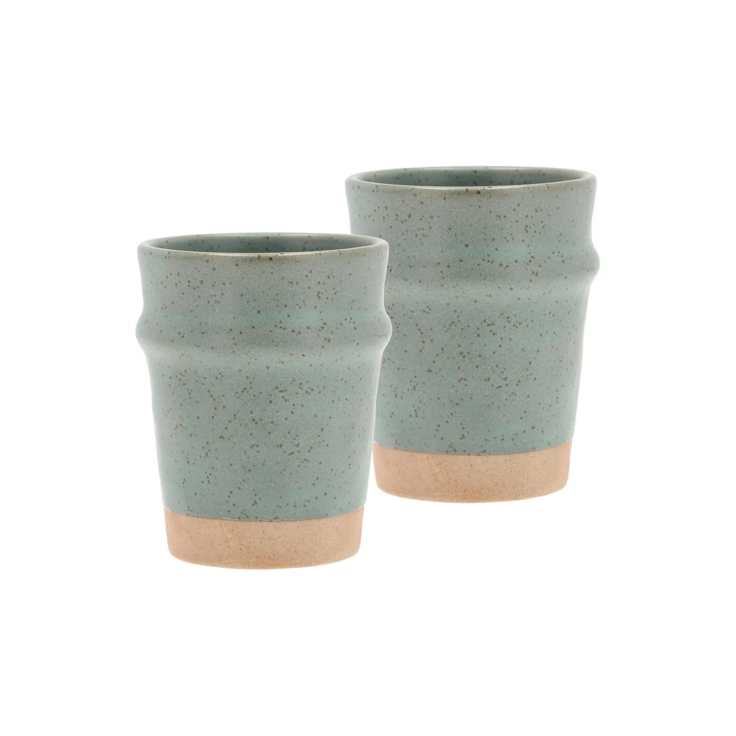 2 porcelænskrus, 35 cl, med en smuk, reaktiv glasur. De har et fantastisk udseende med en unik overflade, da hvert enkelt produkt er hånddekoreret, og derfor kan farve og overflade variere.