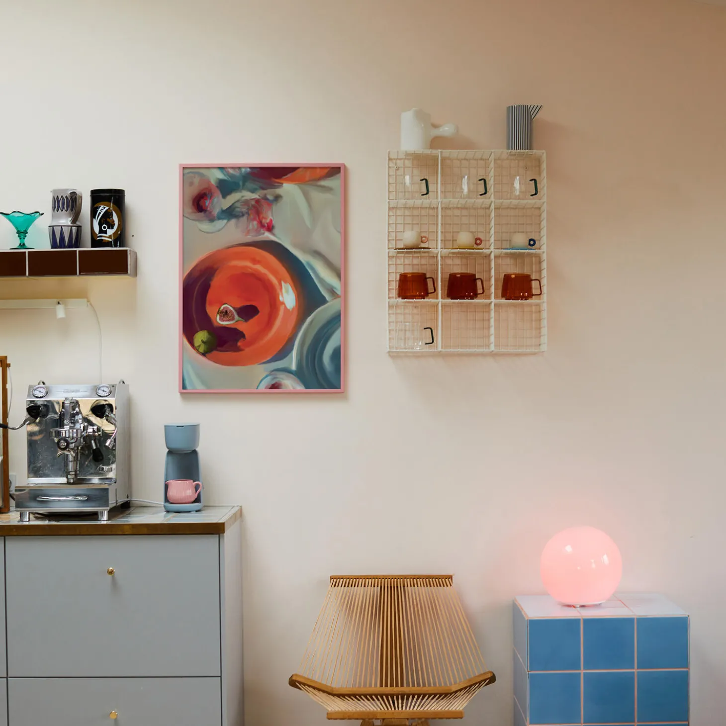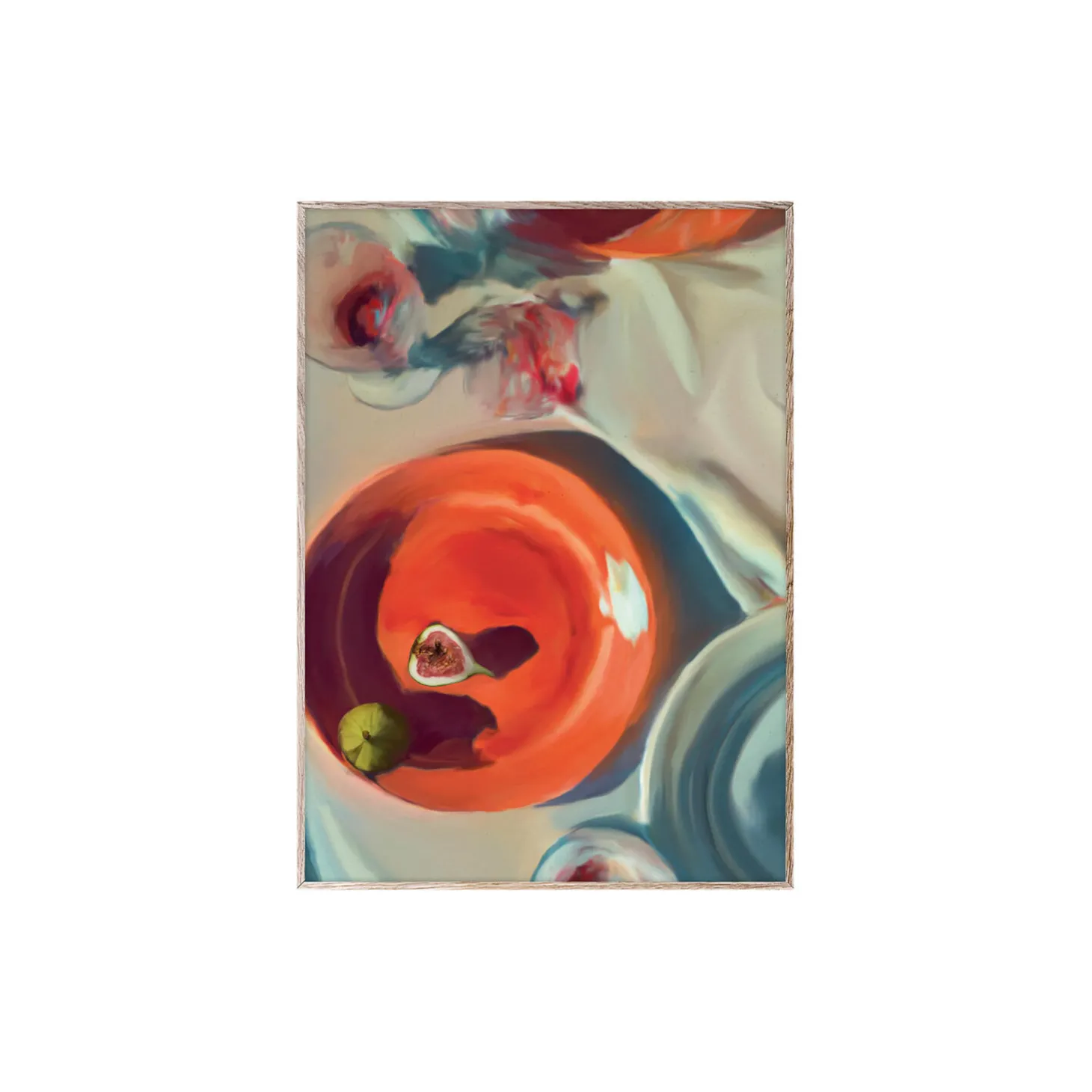 Fine Dining by Danish art group Misfitting Things channels a hazy dinner setting after the consumption of a bottle of wine, or two. Beautifully textured through the artists digital painting techniques, the scene plays with a touch of the psychedelic as shadows and reflections start to blur and spin into the evening. Set against a white backdrop, a vibrant red plate is punctuated by a set of ripe figs. Frame not included.