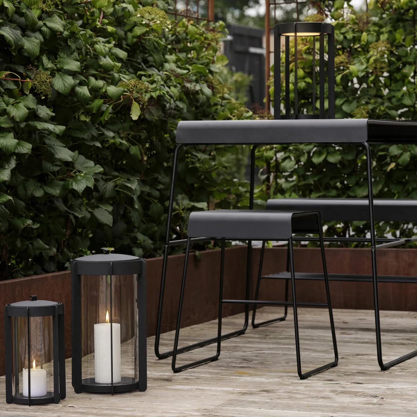 Firefly-lanternen med LED-lys er 30 cm høj og har en rund top, der kan vippes. Det gør det muligt at kaste smukke og stemningsfulde stråler lige der, hvor du har lyst. Sæt en lille serie på række på terrassen og lav lyskunst op ad væggen. Du kan også finde en favoritplante eller skulptur, som du ønsker at sætte særligt spot på. Endelig kan du vælge at pege lyskeglen nedad og skabe et mere traditionelt lanterne-look. Bemærk det skjulte håndtag, der kan vippes op og sikrer praktisk flytbarhed såvel som et ændret udtryk. Mulighederne er mange, og lyset lækkert. Lanternen er udført i pulverlakeret aluminium og godkendt til udendørs brug. 3-trins lysdæmper med touch-funktion. For at tænde lampen skal du trykke på den runde knap på siden: Første berøring: 100 % lyseffekt Anden berøring: 50 % lyseffekt Tredje berøring: 25 % lyseffekt Fjerde berøring: Lampen slukkes Hvis batteriet er helt fladt, er opladningstiden ca. 3-4 timer. Oplades via det medfølgende USB-C-kabel. Lyser i op til 8 timer med 100 % lyseffekt, 20 timer ved 50 % lyseffekt og 30 timer ved 25 % lyseffekt.