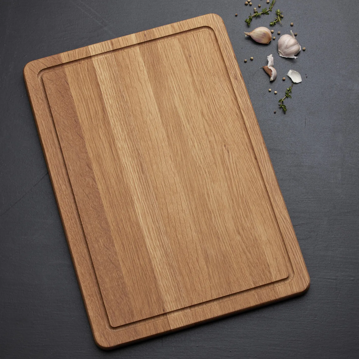 Det smukke og solide skærebræt er fremstillet af olieret eg og har mange anvendelsesmuligheder. Den ene side af skærebrættet er udstyret med en saftrille, der opsamler saft bl. a. fra kød, og den anden side er glat. Begge sider kan anvendes til udskæring og servering. Dette skærebræt er bl. a. velegnet til udskæring og servering af større stege samt anretning og servering af tapas. Læg aldrig dit skærebræt i blød. Vaskes med varmt vand og mild sæbe. Tåler ikke opvaskemaskine. Kan med fordel efterbehandles med madolie et par gange om året. Design: Hans Sandgren JakobsenVaren er produceret i FSC®-certificeret egetræ (FSC-C166612).