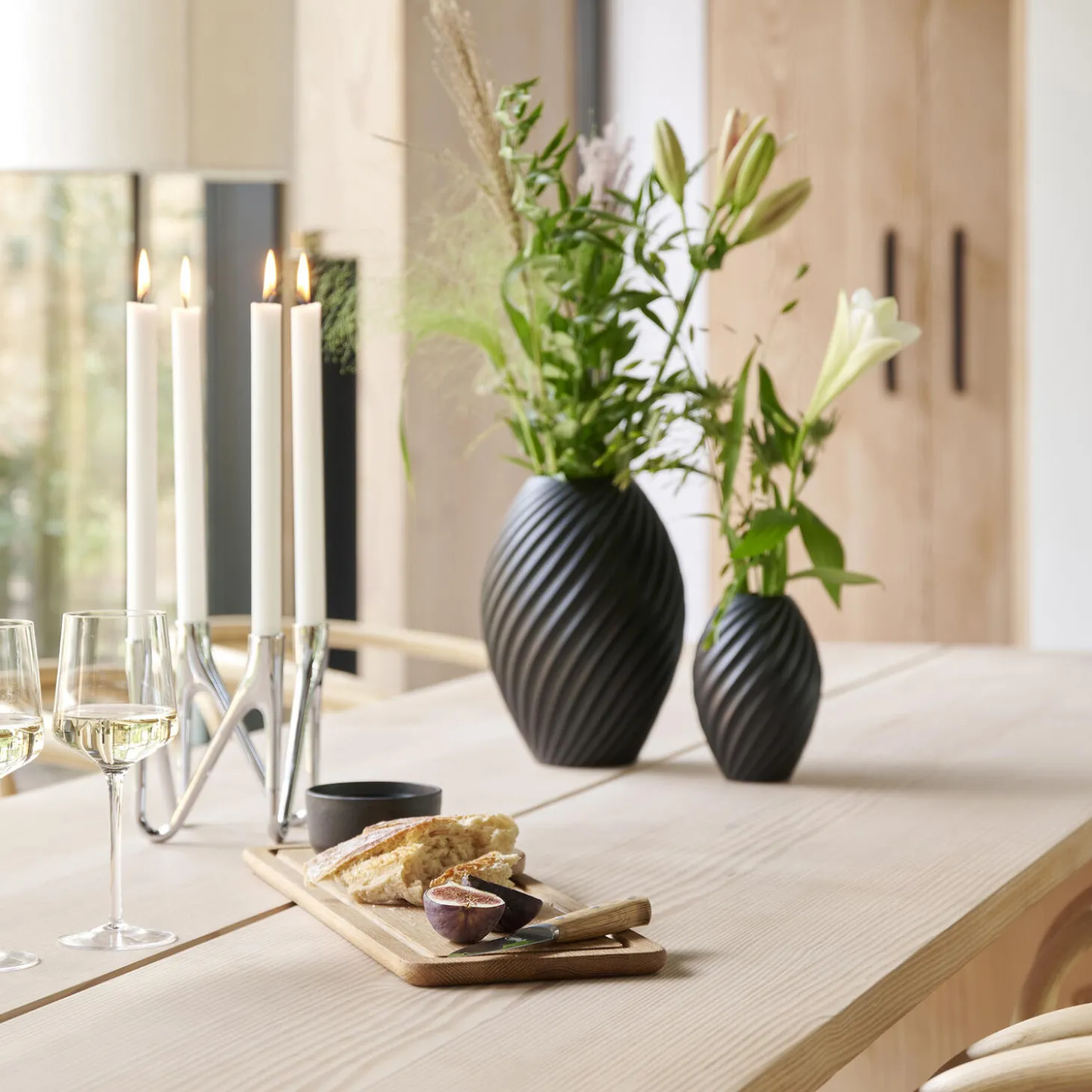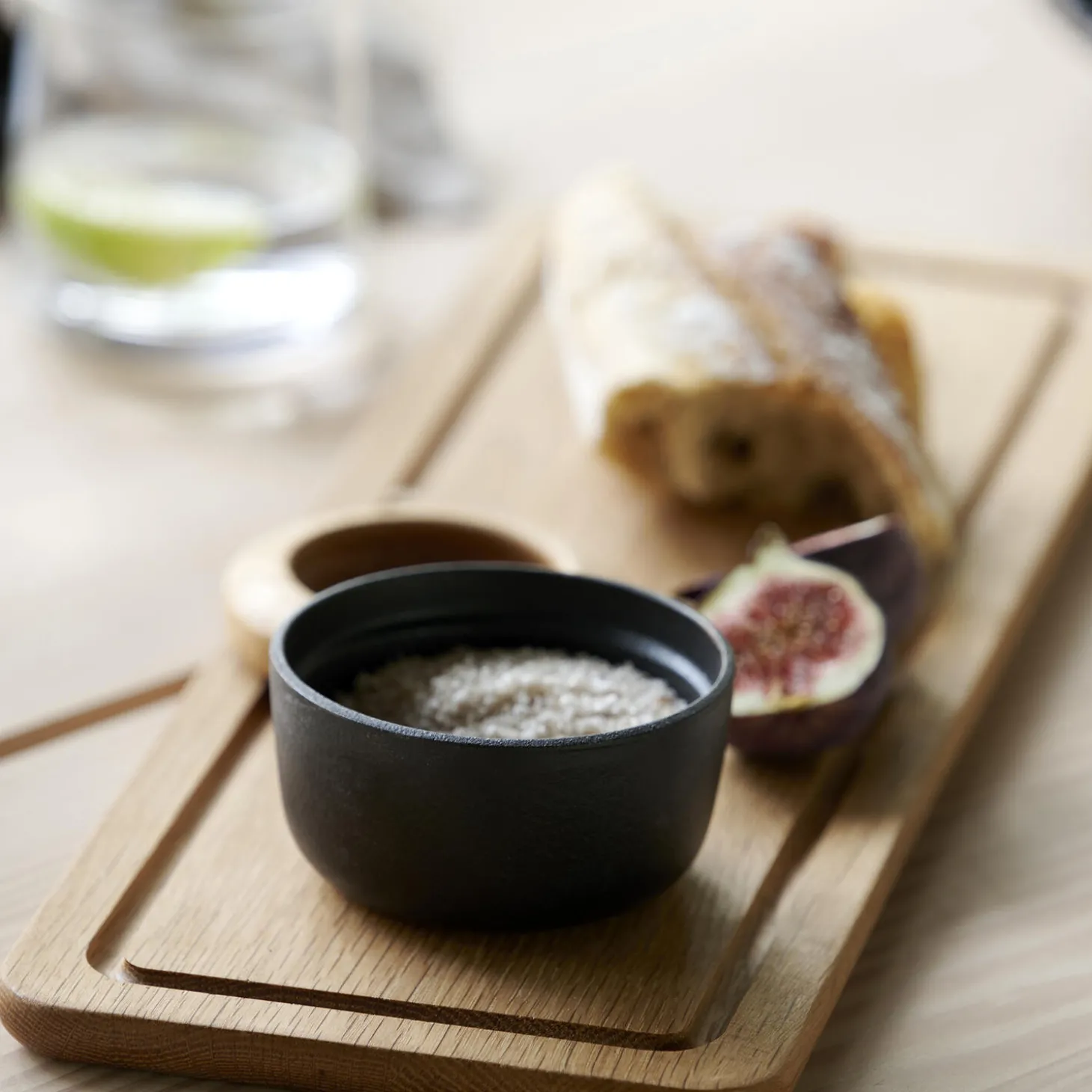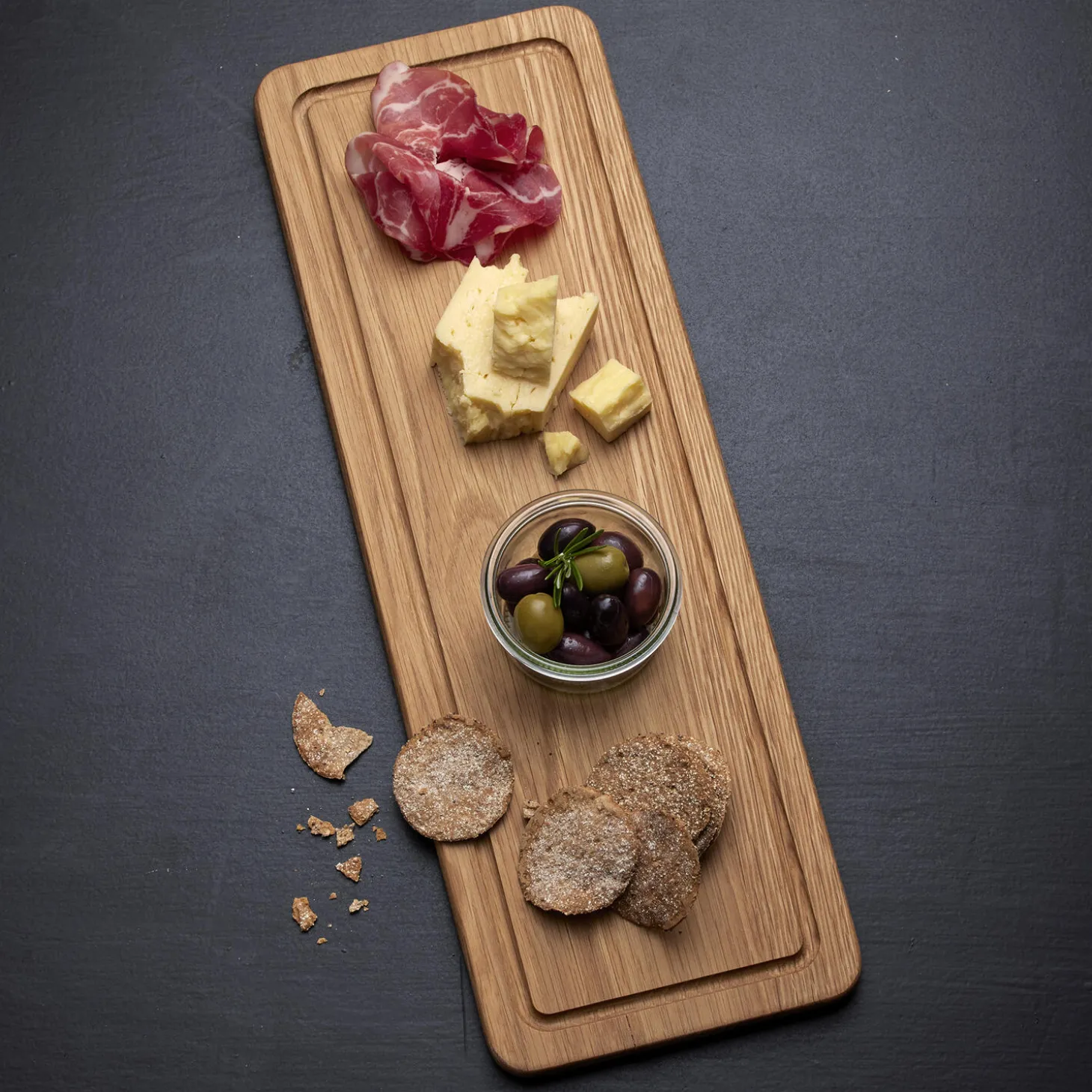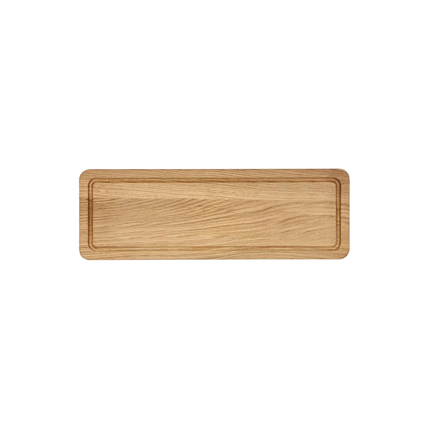 Det smukke og solide skærebræt er fremstillet af olieret eg og har mange anvendelsesmuligheder. Den ene side af skærebrættet er udstyret med en saftrille, der opsamler saft bl. a. fra kød, og den anden side er glat. Begge sider kan anvendes til udskæring og servering. Det rektangulære skærebræt er bl. a. velegnet til udskæring og servering af fisk og mørbrad samt anretning og servering af tapas. Læg aldrig dit skærebræt i blød. Vaskes med varmt vand og mild sæbe. Tåler ikke opvaskemaskine. Kan med fordel efterbehandles med madolie et par gange om året. Design: Hans Sandgren JakobsenVaren er produceret i FSC®-certificeret egetræ (FSC-C166612).