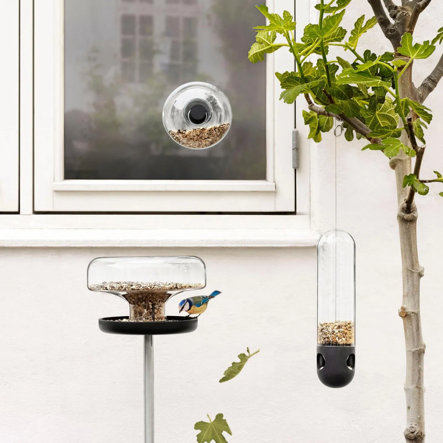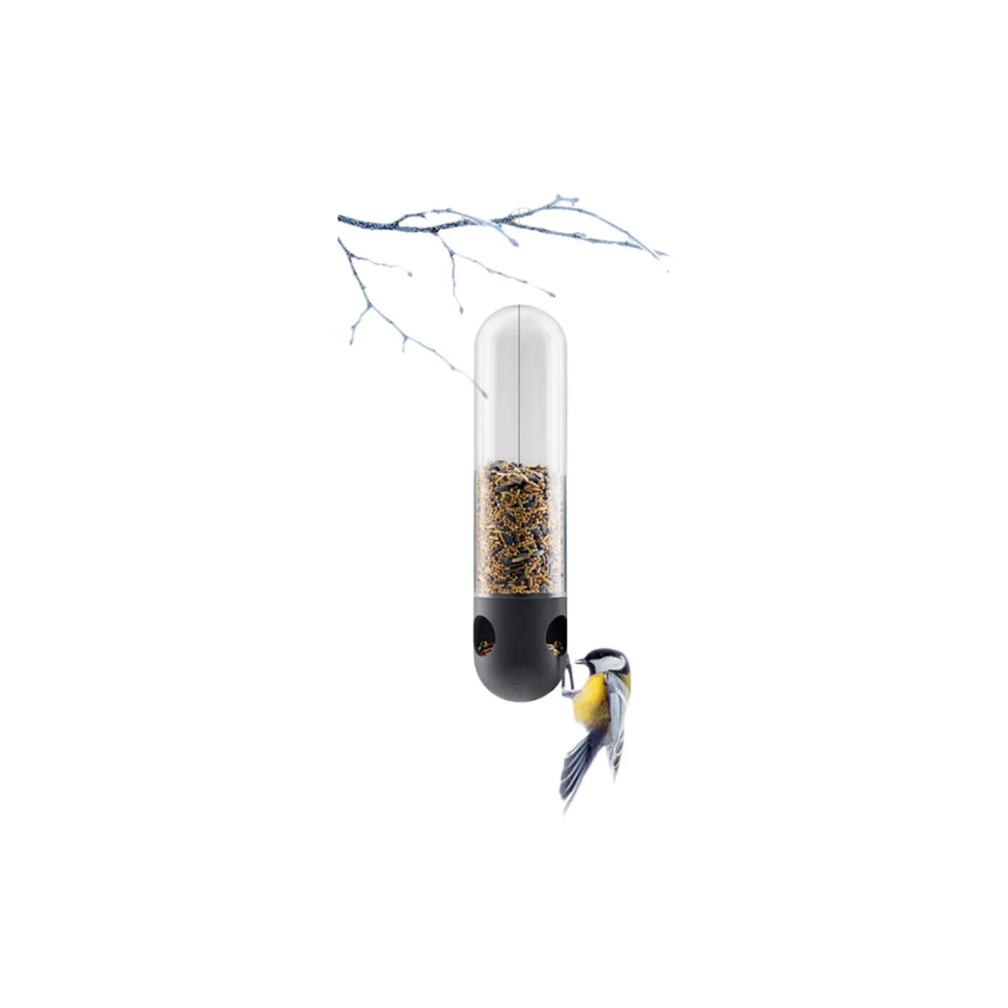 Eva Solo Fuglefoderrør ophænges i sin wire på en gren i et træ eller en busk. Fuglefoderrøret forsyner gavmildt småfuglene med frø. De små åbninger nederst i foderrøret gør det nemt for småfugle at gribe fat i røret og spise. Det gennemsigtige rør fortæller, når det er tid til opfyldning. Røret skilles let ad i to dele, som begge tåler maskinopvask.