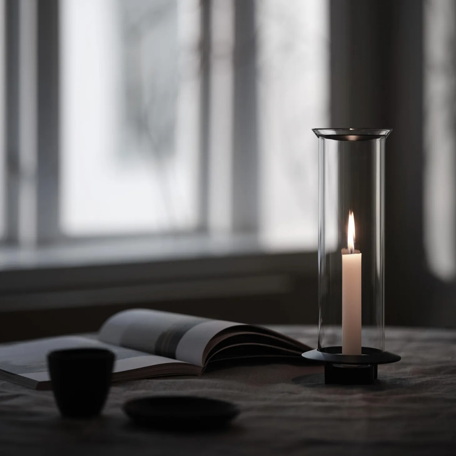 Our idea was to create a simple, yet sleek, candle holder behind glass that protects against drafts while also providing oxygen circulation to the lit flame. The design is tailored for a pillar candle between 20-24 cm in height but can also accommodate thicker candles, up to 4 cm in diameter, or tea lights if the inner insert is removed.