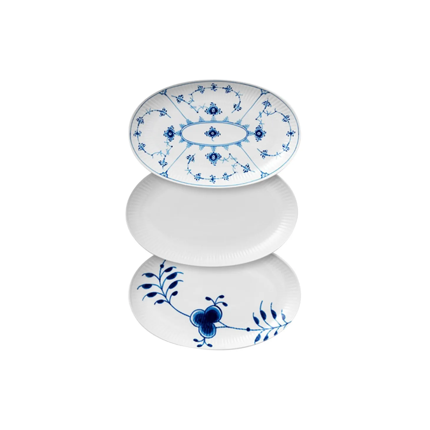 Gifts With History asiet i porcelæn fra Royal Copenhagen.De tre Asietter i dette Gifts with History sæt er lige så smukke, som de er alsidige. Asietterne er dekoreret med det klassiske mønster fra Musselmalet Riflet, det grafiske mønster fra Blå Mega Riflet og de tidløse rifler fra Hvid Riflet. Sættet med tre asietter er en oplagt gaveidé eller en smuk tilføjelse til en eksisterende samling.