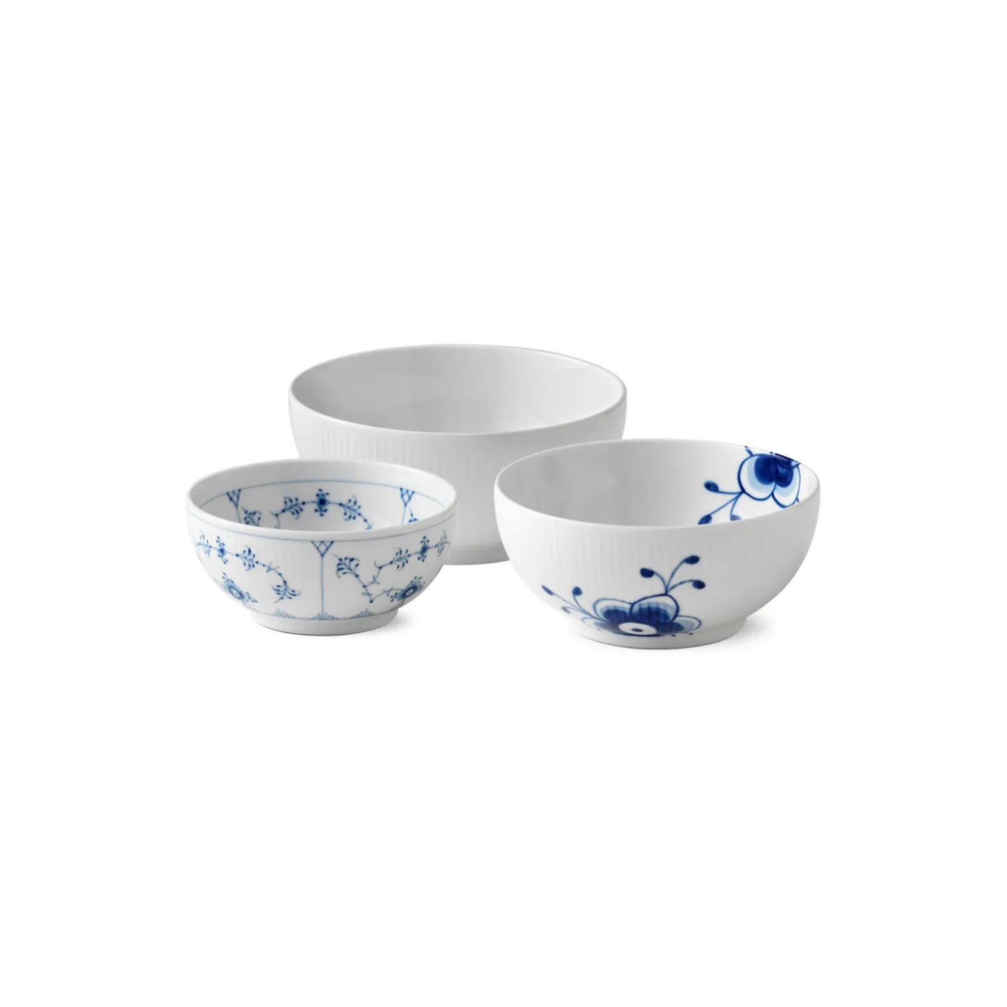 Gifts With History skålsæt i porcelæn fra Royal Copenhagen. Dette sæt bestående af tre skåle repræsenterer på elegant vis tre velkendte stel fra Royal Copenhagen. Sættet består af en skål på 47 cl i Musselmalet Riflet, en skål på 73 cl i Blå Mega Riflet og en skål på 110 cl i Hvid Riflet. De tre skåle er smukke hver for sig og tilsammen, og det elegante sæt er en oplagt gaveidé til en, du har kær.