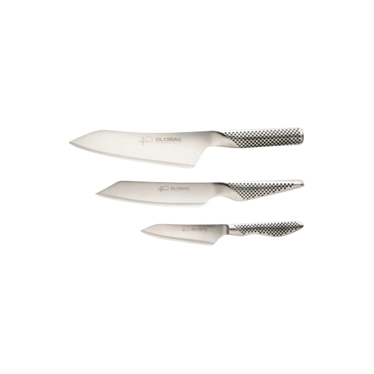 Globalkniven tog hele verden med overraskelse, da den blev lanceret. Nu fylder kniven 40 år og er skarpere end nogensinde. Dette knivsæt er udviklet til Globals 40-års jubilæum og fås kun i en begrænset udgave. Sættet består af en kiritsuke på 15 centimeter, en kokkekniv på 18 centimeter og en universalkniv på 11 centimeter. Kiritsuken sælges også enkeltvis.