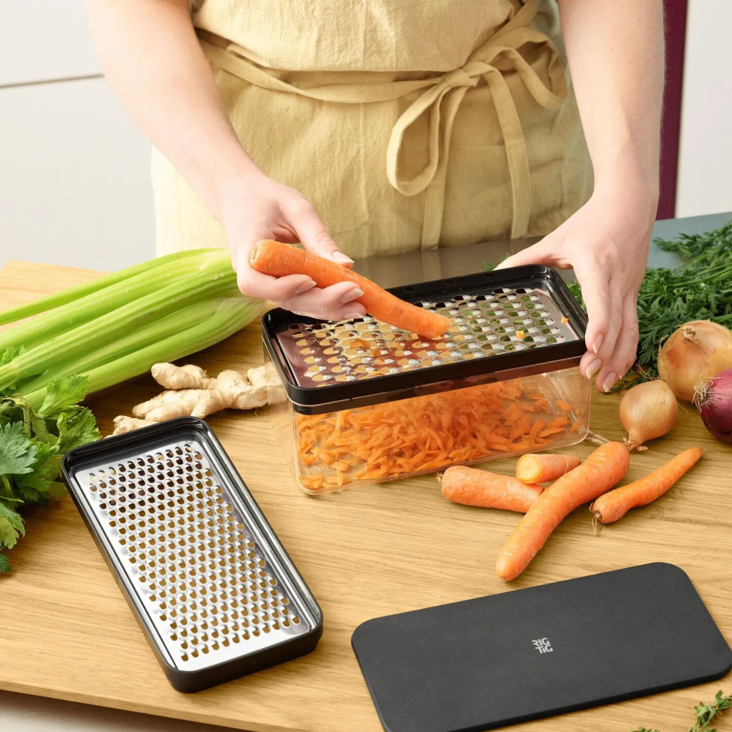 Smart rivejern med beholder og låg. GRATE-IT består af en beholder med låg og to rivejern med henholdsvis et groft og fint jern. Rivejernet river let gulerødder, æbler og andre grøntsager samt ost. Det revne produkt samler sig fint i den integrerede opsamlingsboks i stedet for at ryge ud over hele køkkenbordet. Hvis der rives mere, end der skal bruges, kommer rivejernet med et låg, så den overskydende gulerod eller ost let kan opbevares i køleskabet uden at skulle over i en anden beholder. Rivejernene tåler opvaskemaskinen, mens selve boksen bedst vaskes af i hånden.