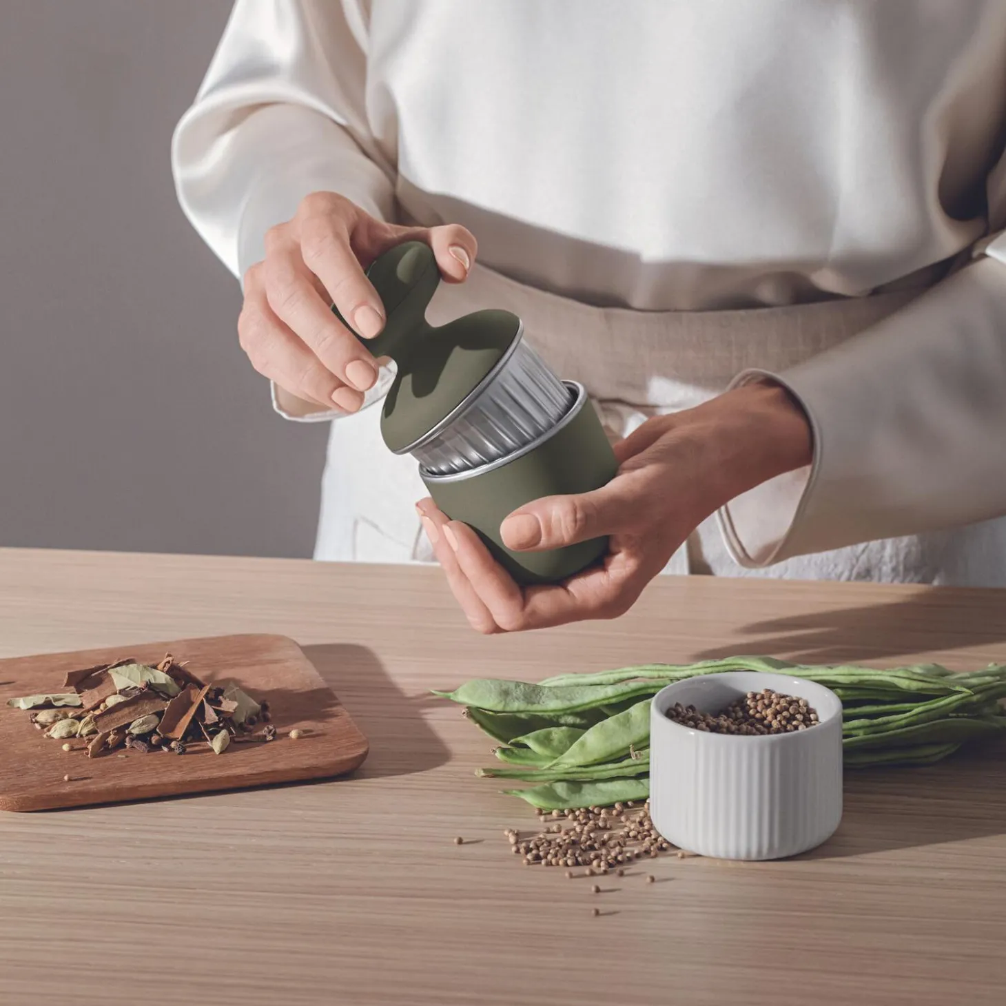 Green tools kollektionen gør det nemt at vælge det grønne køkken med en række redskaber, som gør tilberedning let og hurtig. Alle redskaber og knive er netop udviklet med fokus på tilberedning af grøntsager og frugt. Rengøringen er lige til at gå til, da alle redskaber tåler maskinopvask. Kværn og knus krydderierne med et simpelt twist frem og tilbage. De udvalgte smagsgivere opsamles i underskålen og er lige til at bruge i maden. Den organiske form giver knuseren et godt og behageligt greb.
