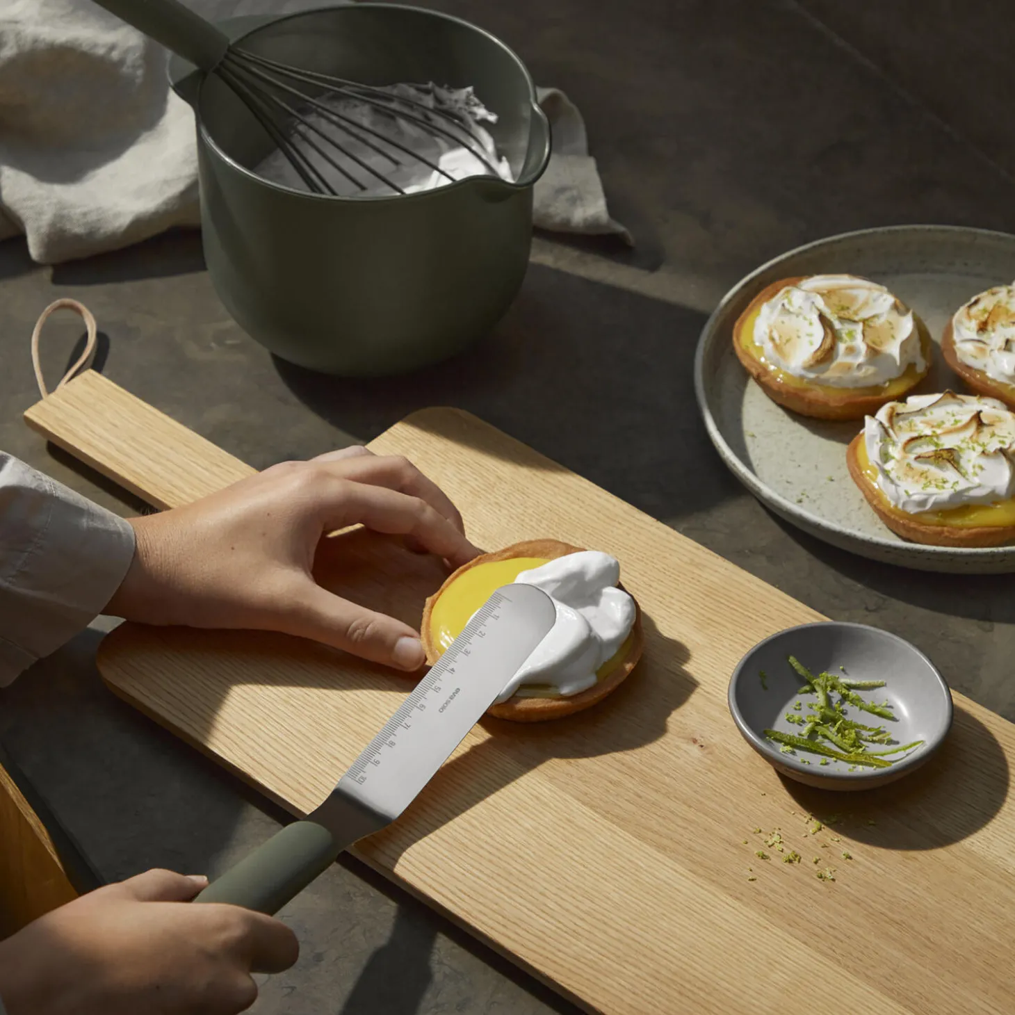 Green tools’ Paletkniv er et multifunktionelt køkkenværktøj med et smukt, tidløst udtryk. Det vinklede blad gør det nemt at sprede glasur eller frosting jævnt over en kage, især på siderne, uden at din hånd kommer i vejen eller rører ved kagen. Formen og vinklen gør det yderligere nemt at skære og løfte stykker af kage, tærte eller andre bagværk uden at beskadige dem. Paletkniven kommer også til sin ret, når der skal vendes eller tages ting fra en varm pande. Det behagelige håndtag sikrer solidt greb og ligger godt i hånden. Paletkniven tåler maskinopvask.