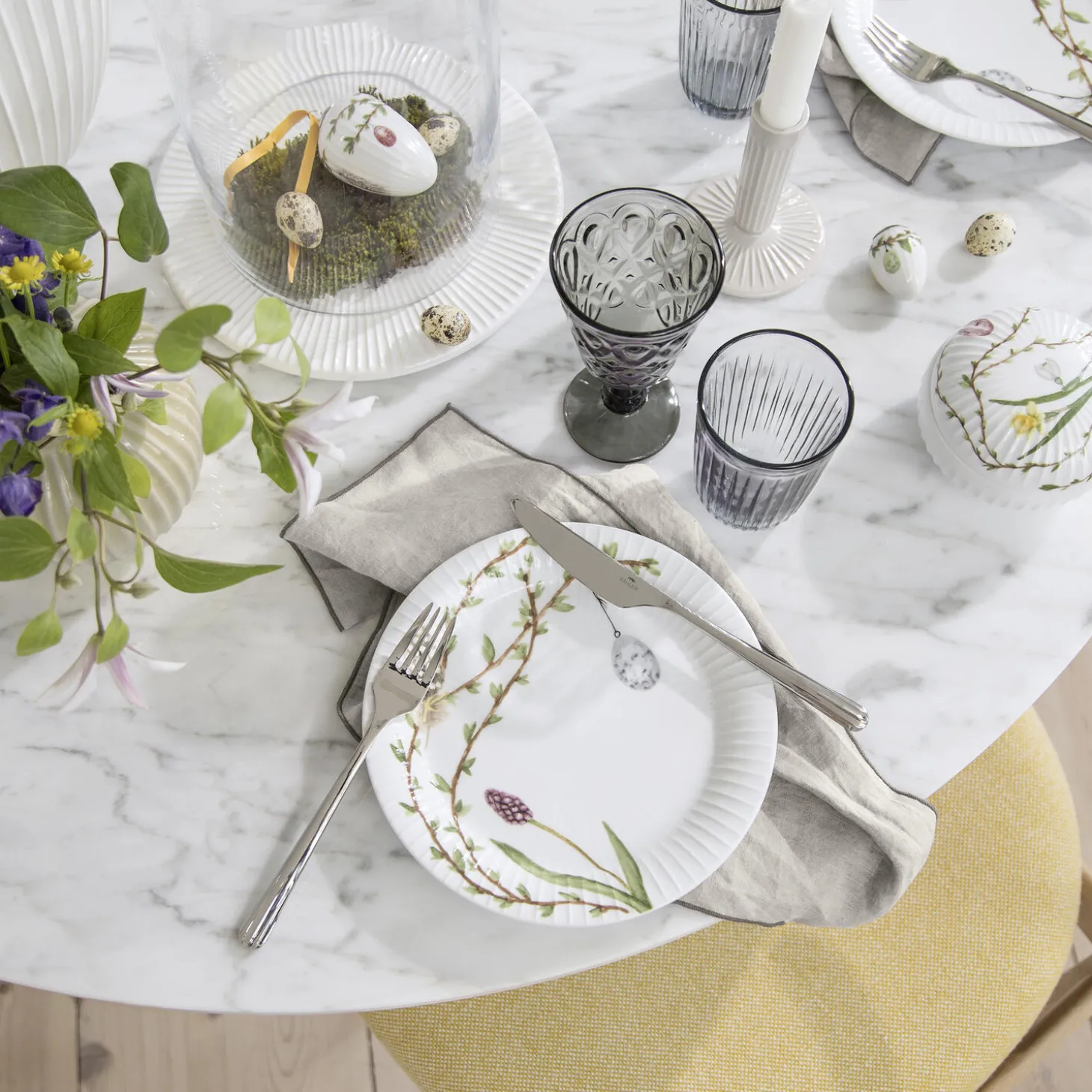 Påske går ofte hånd i hånd med de første forårsfornemmelser – og den stemning er på smukkeste vis indfanget i Hammershøi Easter. Den eventyrligt smukke påskekollektion er dekoreret med nyudsprungne grene og traditionsrige påskesymboler, der er håndmalet af Rikke Jacobsen og overført til porcelænet. Miks påske-stellet med Hammershøis klassiske hvide stel og skab et moderne påskebord med enkle virkemidler. Tåler maskinopvask. Hammershøi Easter-kollektionen indeholder også et krus, en bonbonniere og påskeophæng. Hammershøi Easter-tallerkenen har 2 års brudgaranti.