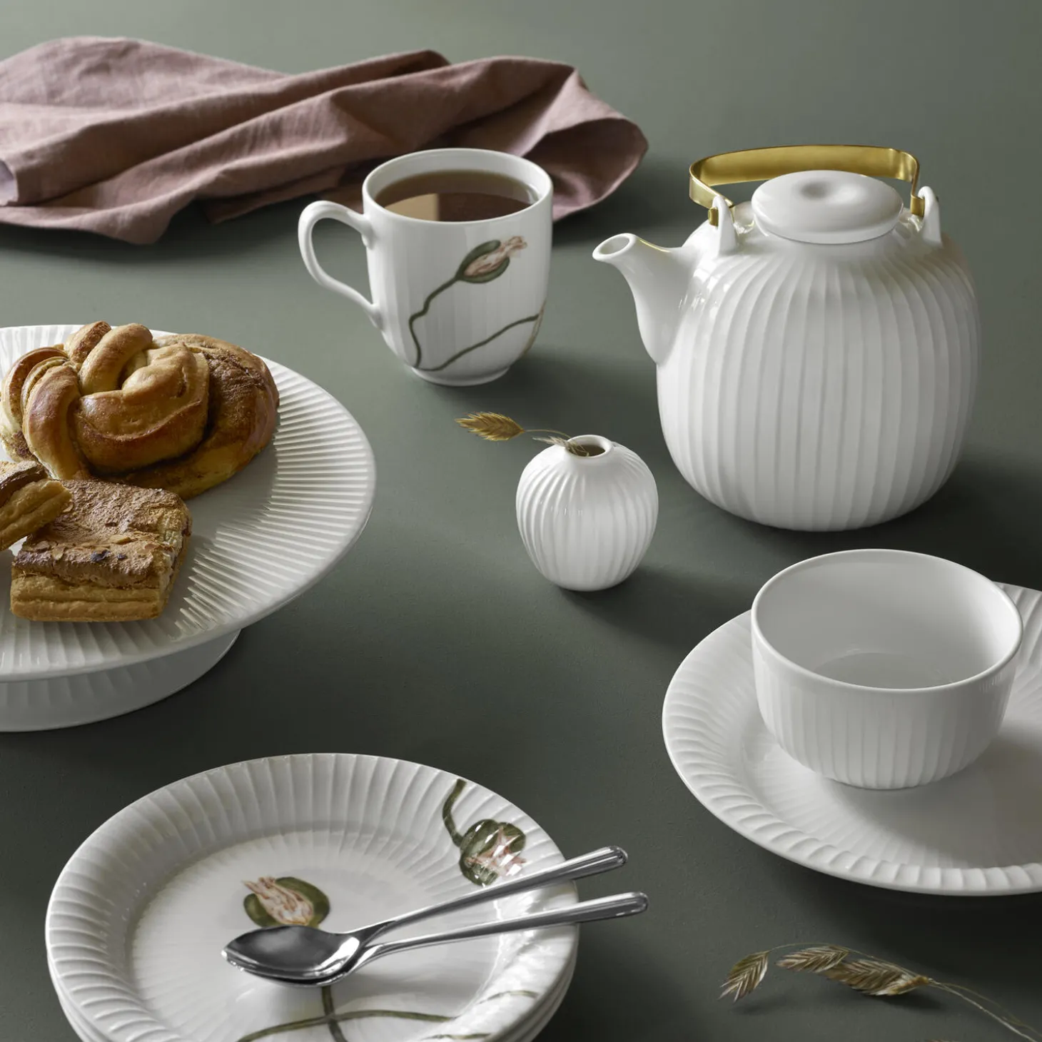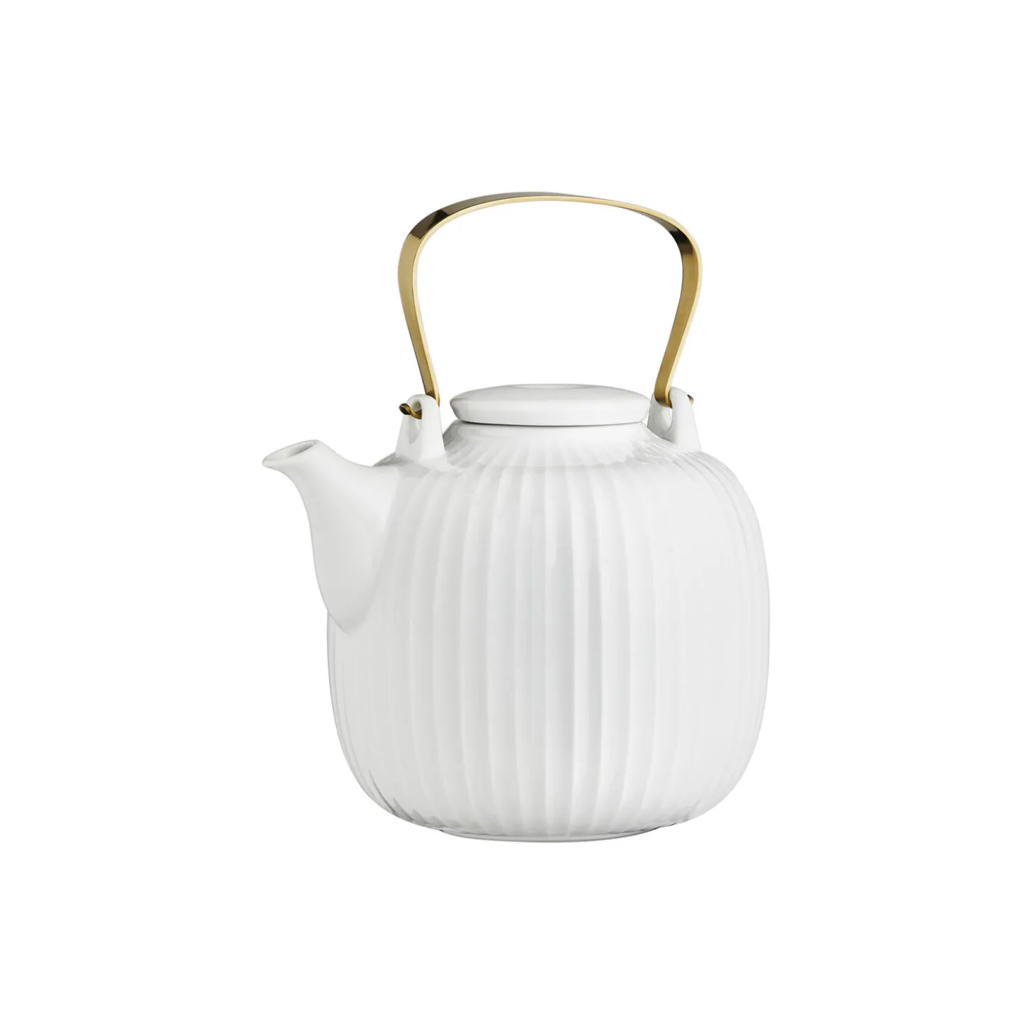 Den hvide tekande fra Hammershøi-serien er formet i porcelæn og indbyder til hjemlig, luksuriøs hygge og samvær om en velbrygget kop te. Tekanden har et elegant, moderne formsprog med en dekorativ messingbelagt hank og en praktisk indbygget si, der let skiller tebladene fra teen, hvis du brygger din te på traditionel vis. Hammershøi tekande har 2 års brudgaranti.
