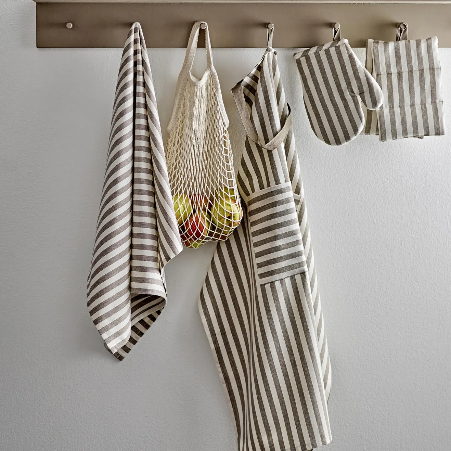 Klassisk og praktisk. Harmony-køkkenserien har et design, der aldrig går af mode, og fås i en ensfarvet udgave samt to stilfulde stribede mønstre. Serien er i genanvendt bomuld og passer ind i alle køkkener. Opgradér dit køkken med Harmony-serien, hvor tidløse produkter blandes med omtanke for miljøet. Den nye model af grydelapper i Harmony-serien er designet med fokus på minimalisme, med quiltning i form af blot to tværgående stikninger. Den rektangulære form gør dem praktiske og nemme at anvende. Grydelapperne og ovnhandskerne beskytter mod kontaktvarme ved 250 °C i maks. 15 sekunder.