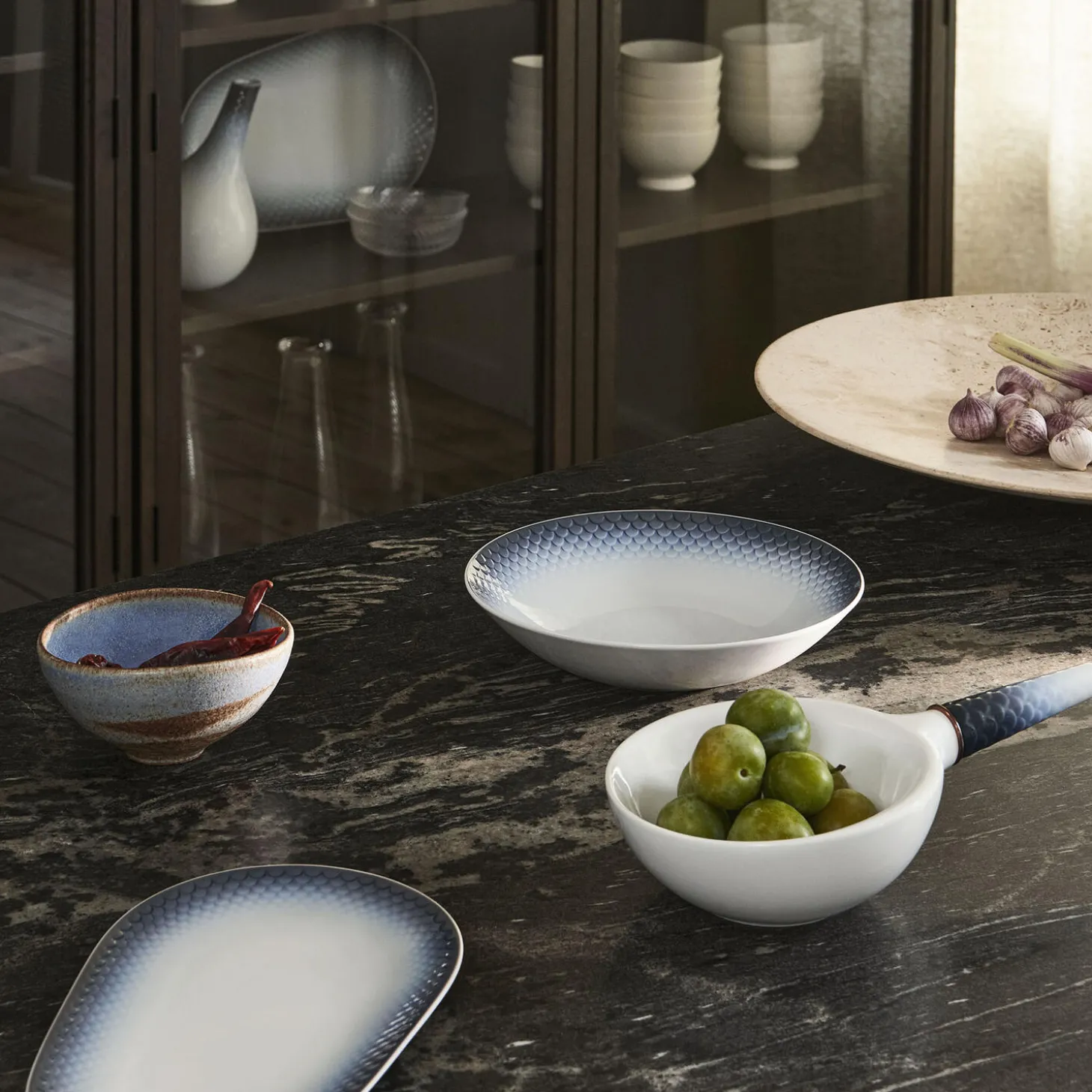 Som en smuk tilføjelse til HAV-stellets sfæriske formsprog indrammer den dybe tallerken både kulinariske mesterværker og hverdagsmiddage. Tallerkenen er sprøjtemalet i hånden; et af Royal Copenhagens mindre kendte, men mest komplicerede, håndværk.