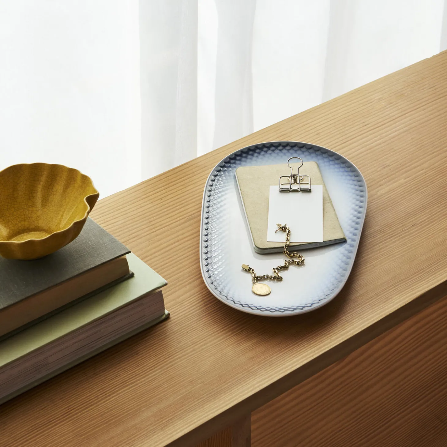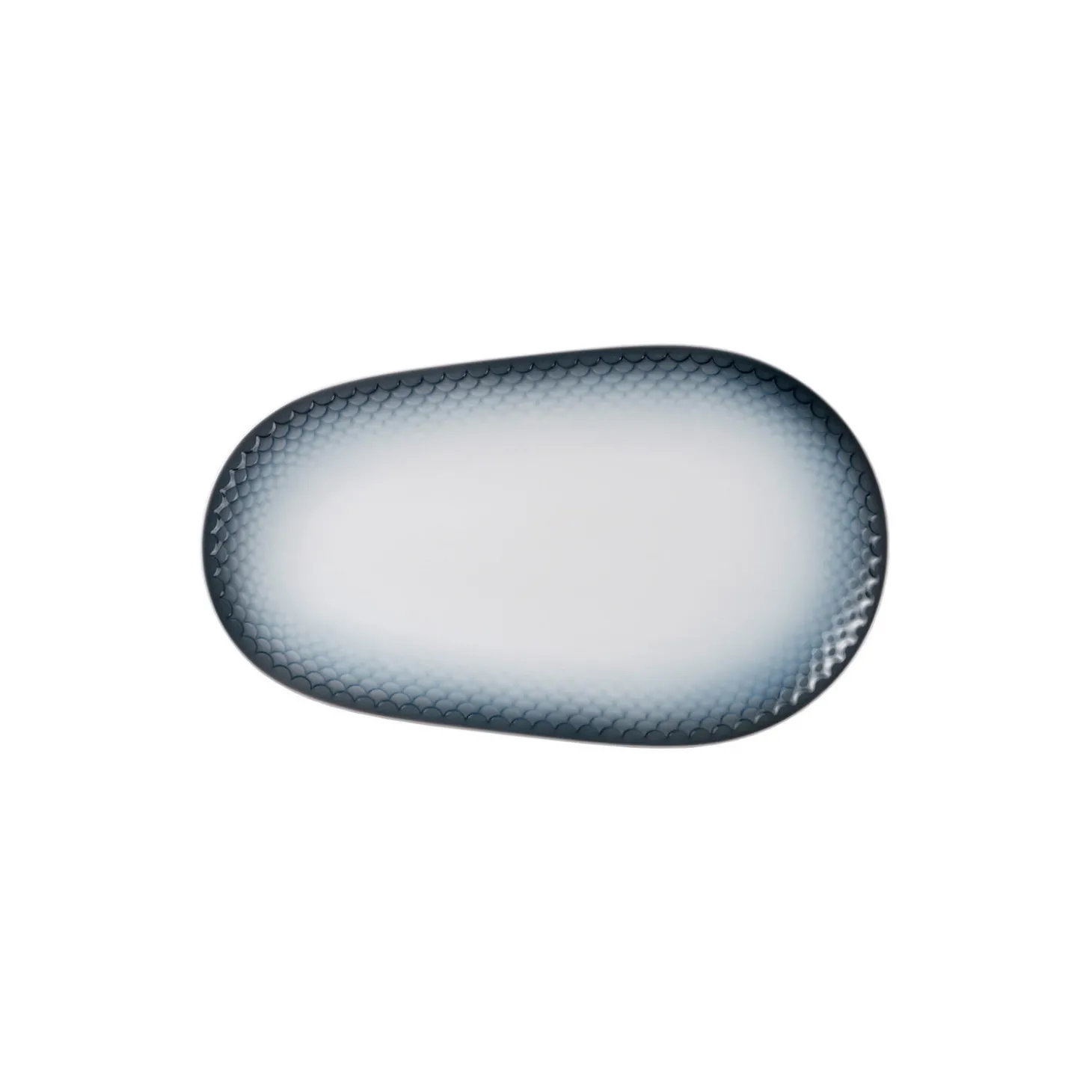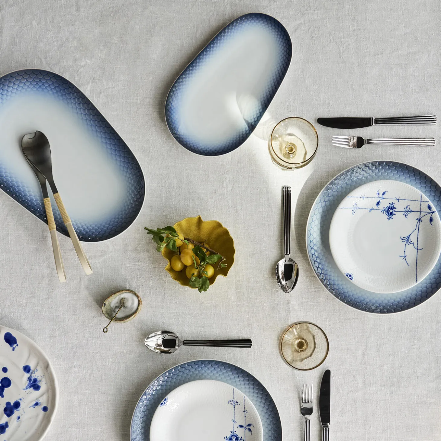Det lille HAV Serveringsfad minder om de blåmuslinger, der findes langs Danmarks kyster. Den slående farvegradering udvikler sig over fiskeskællene fra den mørkeste til den lyseste blå nuance. Ideel til servering af søde og salte snacks.