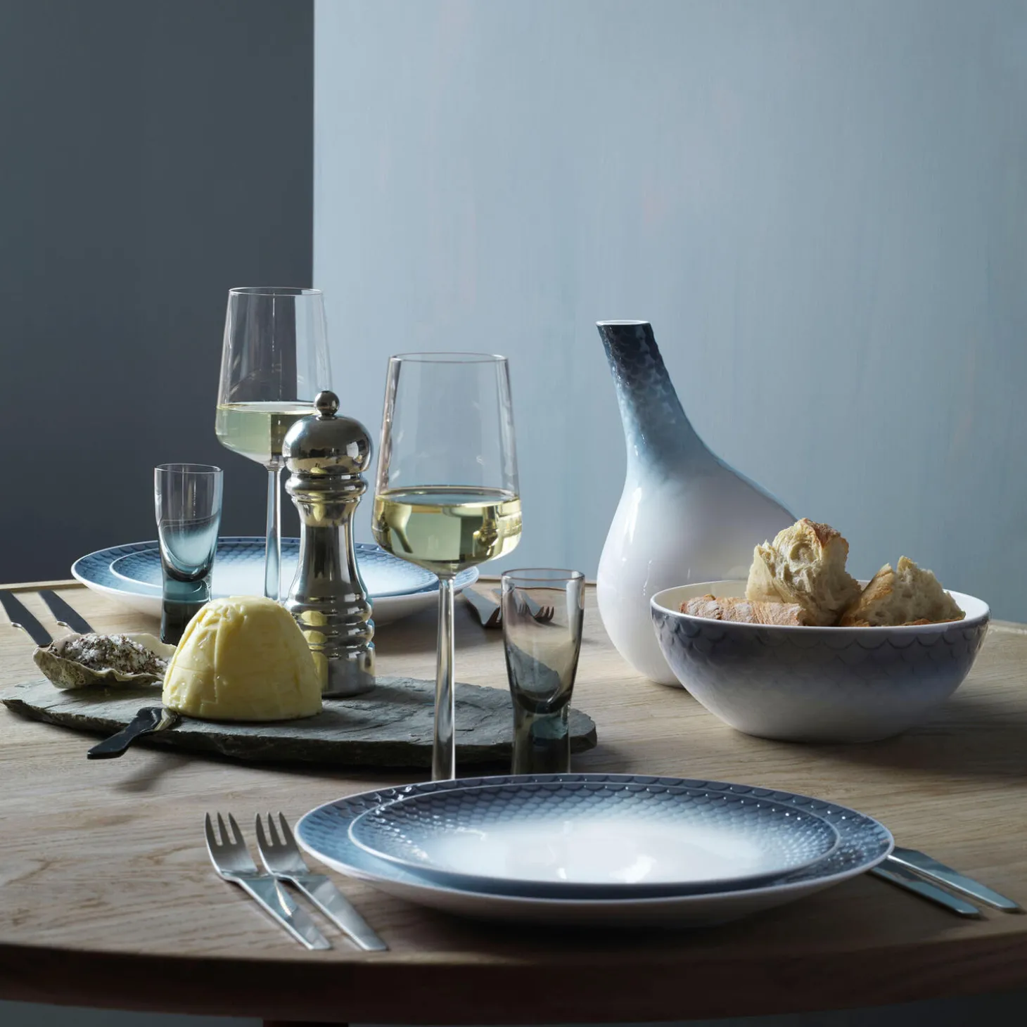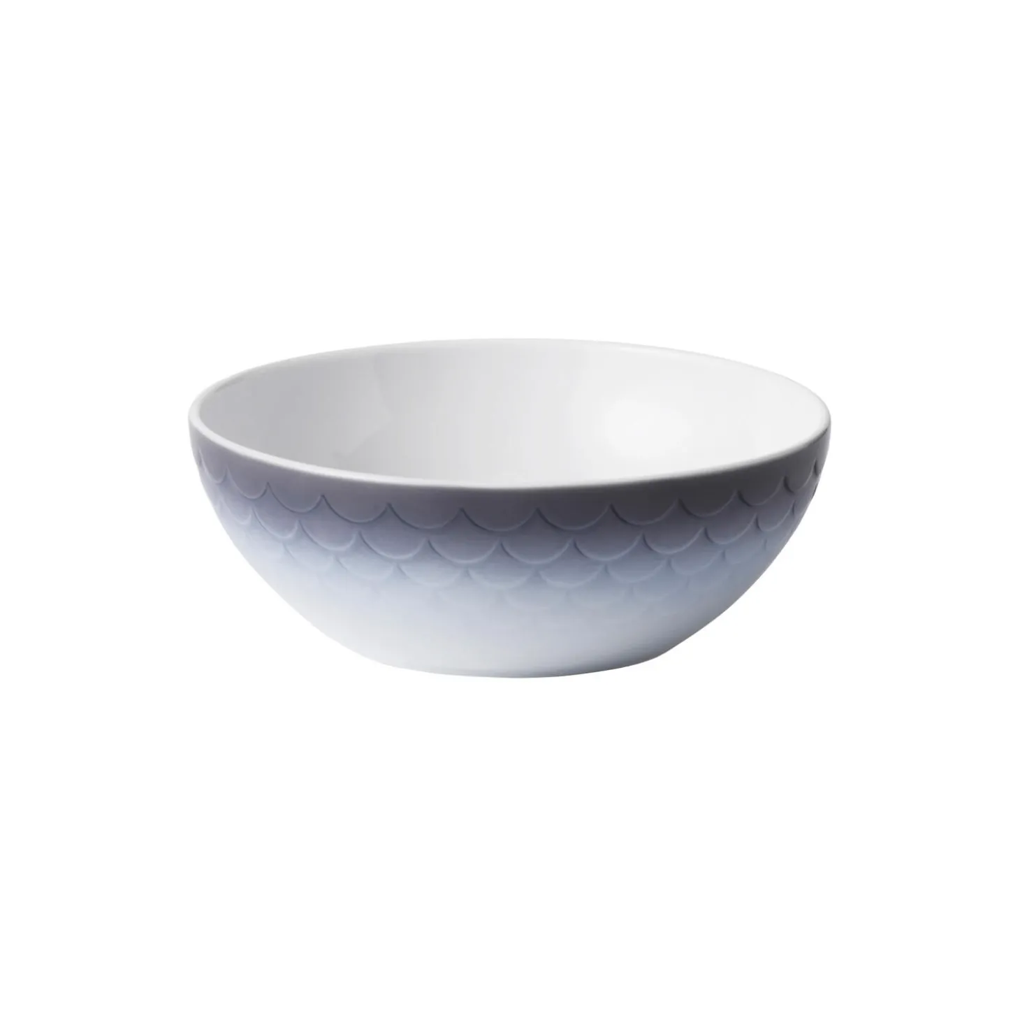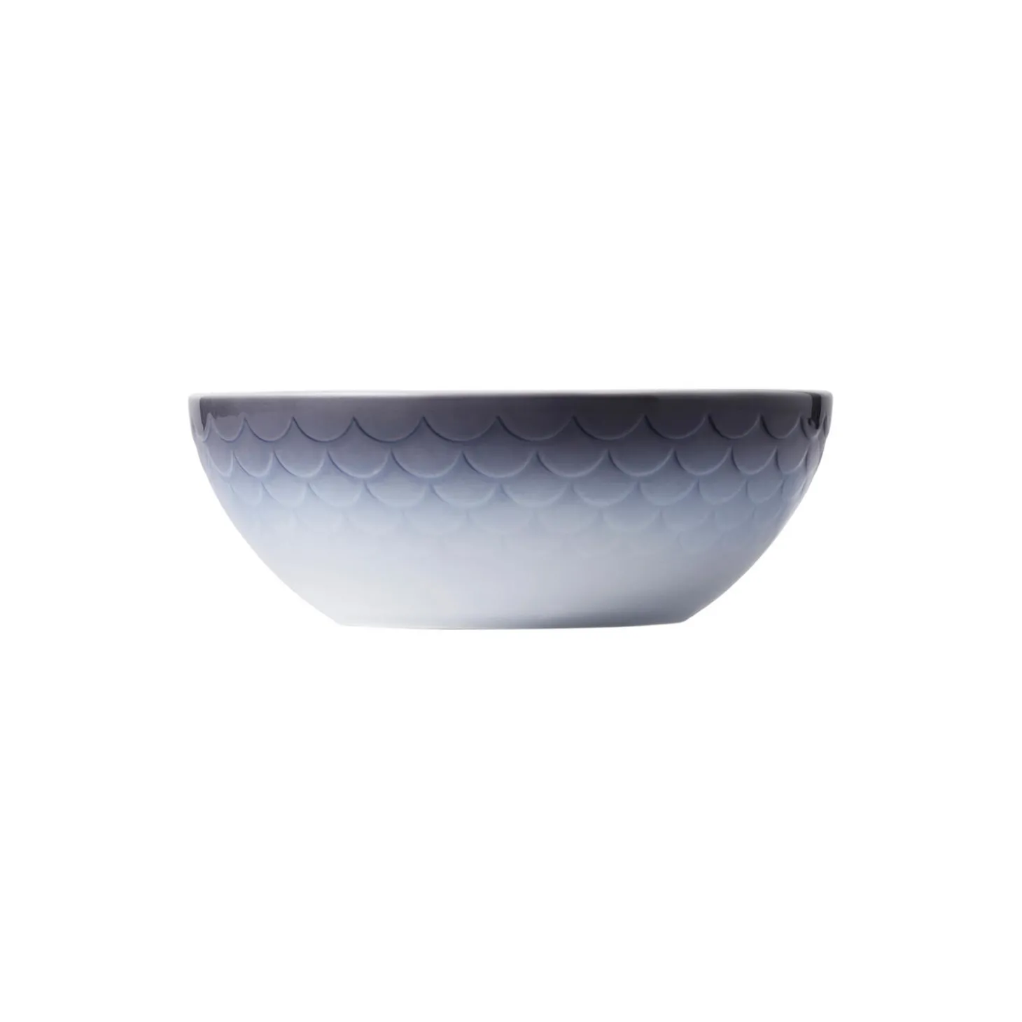 HAV skål i sprøjtemalet porcelæn fra Royal Copenhagen. Med en udsmykning, der bevidst er minimeret, er HAV skålen på 50 cl en multifunktionel steldel, der passer til kontemporære spise- og serveringsmønstre. HAV skålen i tre størrelser er oplagt til alt fra snacks og morgenmad til større serveringer af eksempelvis salater. Den taktile fiskeskælsdekoration, der pryder skålenes yderside, og tonerne i havets tågedis, udgør en overflade, der både kan ses og føles fra alle vinkler.