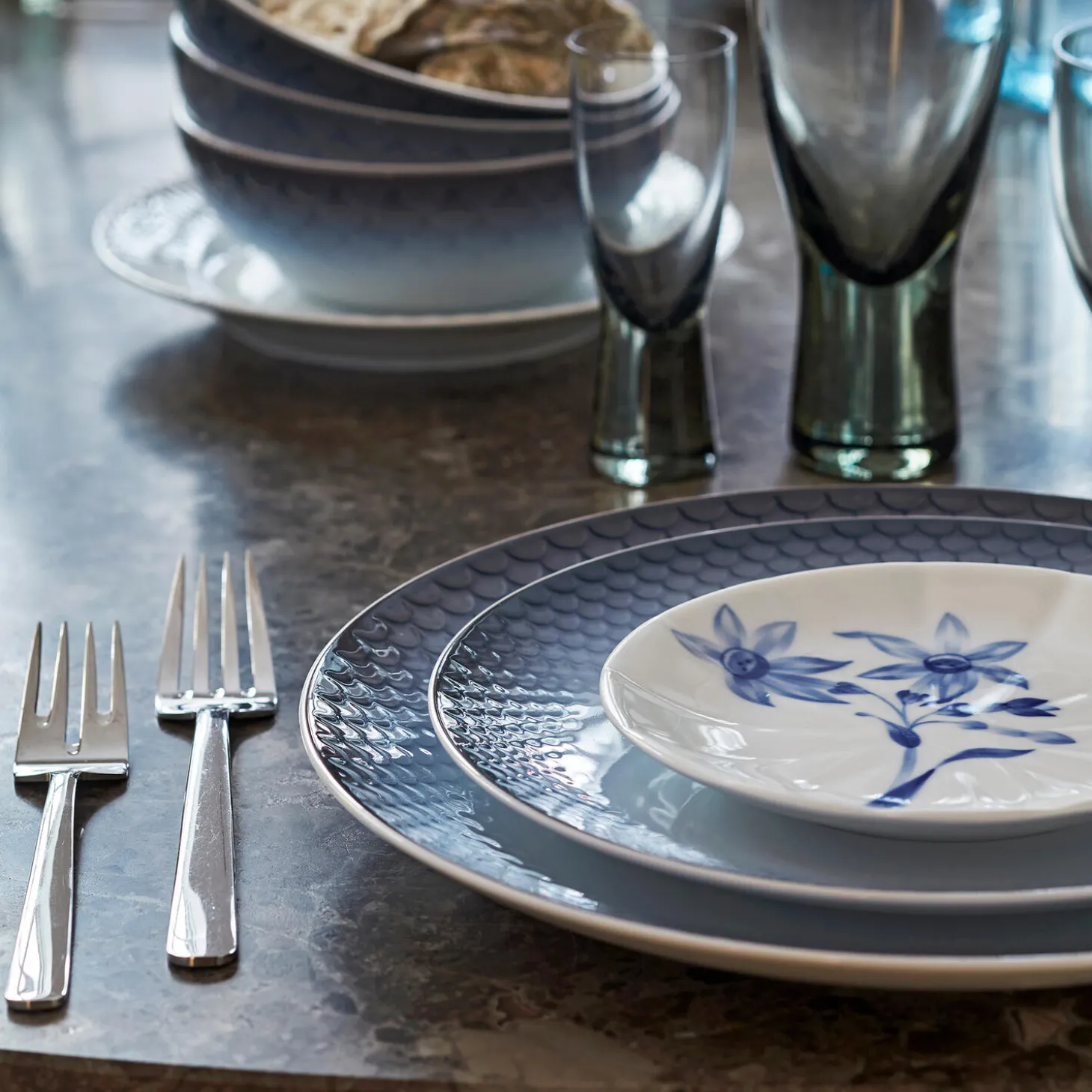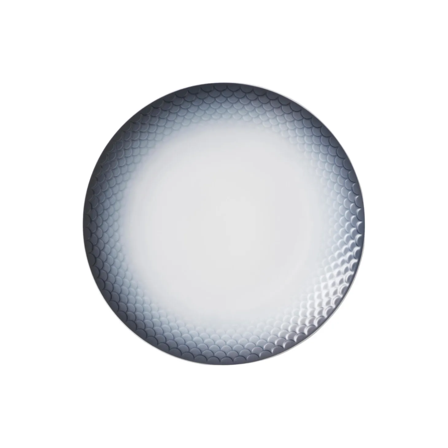 HAV tallerken i sprøjtemalet porcelæn fra Royal Copenhagen. Kanten på HAV Tallerken på 22 cm er omkranset af en sofistikeret dekoration, som er sprøjtemalet på i et drømmende spil af de grøngrå toner af havets dis. Farverne flyder over subtile fiskeskæl og indrammer på smukkeste vis den serverede mad, og skaber en organisk, levende taktilitet til ethvert måltid. Den særlige dybde i kanten på hvert fiskeskæl understreger tallerkenens funktionalitet og skønhed.