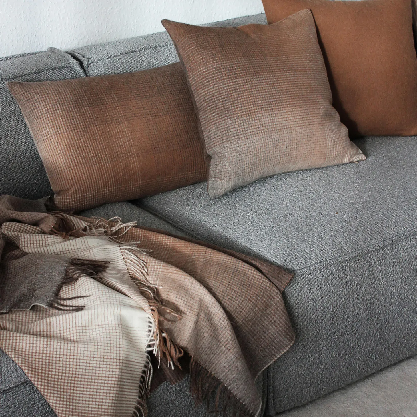 Hvor hav og himmel mødes. Horizon pudens design skifter fra lys til mørk på en elegant, smuk og naturlig måde. Et utroligt smukt stykke håndværk – et sandt vidnesbyrd om en peruviansk vævers talent. Horizon kollektionen består af både plaider og puder i en række utrolig smukke farver.Horizon puden er fremstillet af 100% genanvendte fibre.Puden er vævet af fantastisk blød genanvendt alpakauld og fåreuld. At væve tekstiler af alpakauld er en tradition i Peru, der går tilbage til Inka-tiden. Alpakafibre er blødere, mere slidstærke og varmere end andre naturfibre. Puden fnugger minimalt og bevarer det flotte udtryk i mange år frem. I puden er der anvendt 100% bæredygtige fibre. Elvang er fair trade certificeret på højeste niveau hos World Fair Trade Organization (WFTO). Det er en garanti for, at puden er fremstillet under ordentlige vilkår både for miljø, mennesker og dyr.Materiale: 50% alpakauld, 40% fåreuld & 10% andre fiberVægt: ca. 130 gramStr.: 50×50 cmPuden sælges uden pudefyld. Tænk bæredygtigt og genanvend dit gamle pudefyld. Pudefyld kan også tilkøbes, vores pudefyld er allergivenligt.Pudebetrækket skal renses. Fyldet kan vaskes ved 60 grader, og genvinder sin fylde, når det tørretumbles
