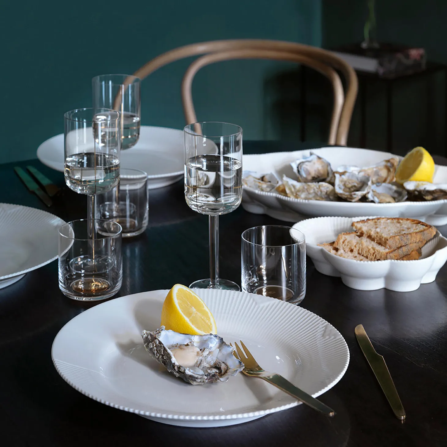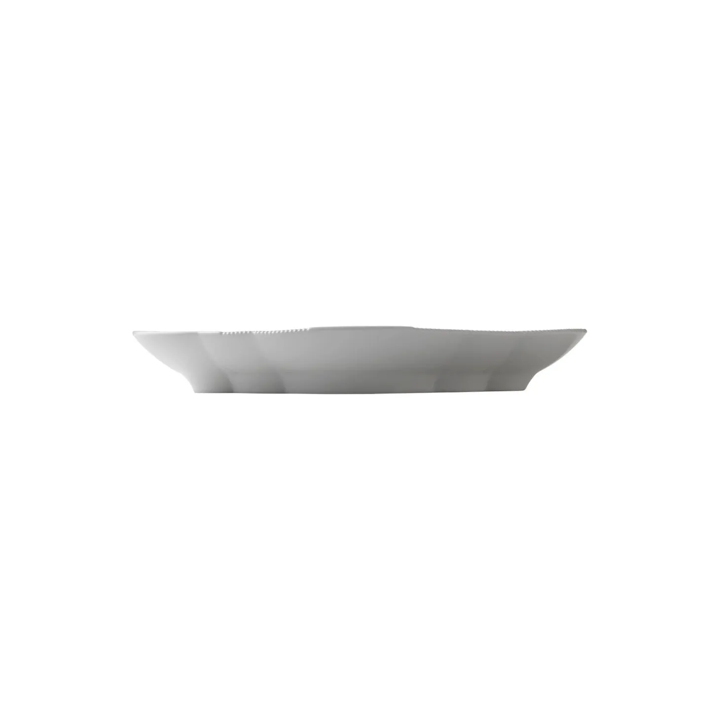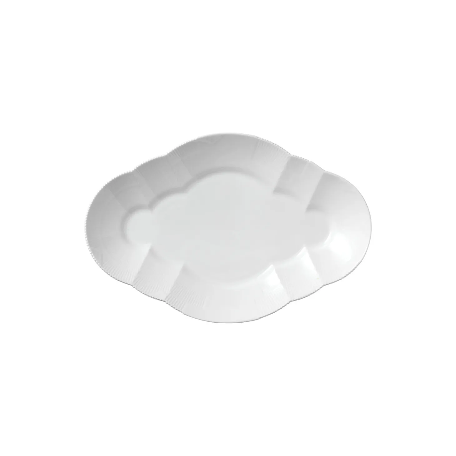 Hvid Elements fad i porcelæn fra Royal Copenhagen. Den høje kant på Hvid Elements Fad på 38,5 cm gør det særdeles velegnet som serveringsfad til retter med dressinger eller vinaigrette. Det symmetriske design brydes af asymmetriske placeringer af porcelænets mønster, som følger den takkede kant fra Flora Danica-stellet i et uhøjtideligt og legende udtryk.