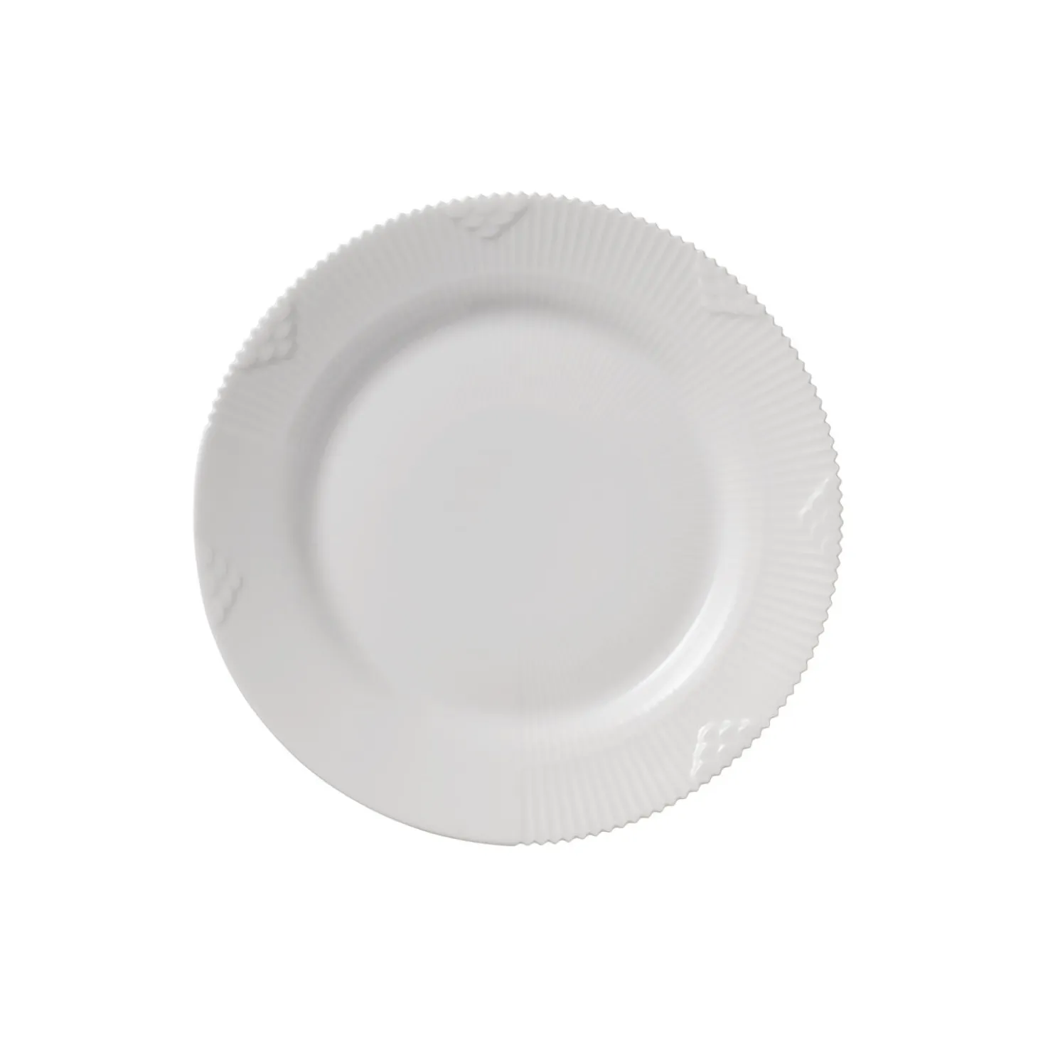 Hvid Elements desserttallerken i porcelæn fra Royal Copenhagen. Denne lille tallerken på 19 cm i Hvid Elements er en ideel frokosttallerken eller desserttallerken. Tallerkenens brede kant er udsmykket med en fin, takket kant inspireret af det historiske Flora Danica-stel. Tallerkenens smukke, charmerende udtryk fuldendes yderligere af håndlavede rifler og fiskeskælsdekorationer. Sæt den alsidige tallerken sammen med steldele fra andre Royal Copenhagen stel og skab en skarp og personlig borddækning.