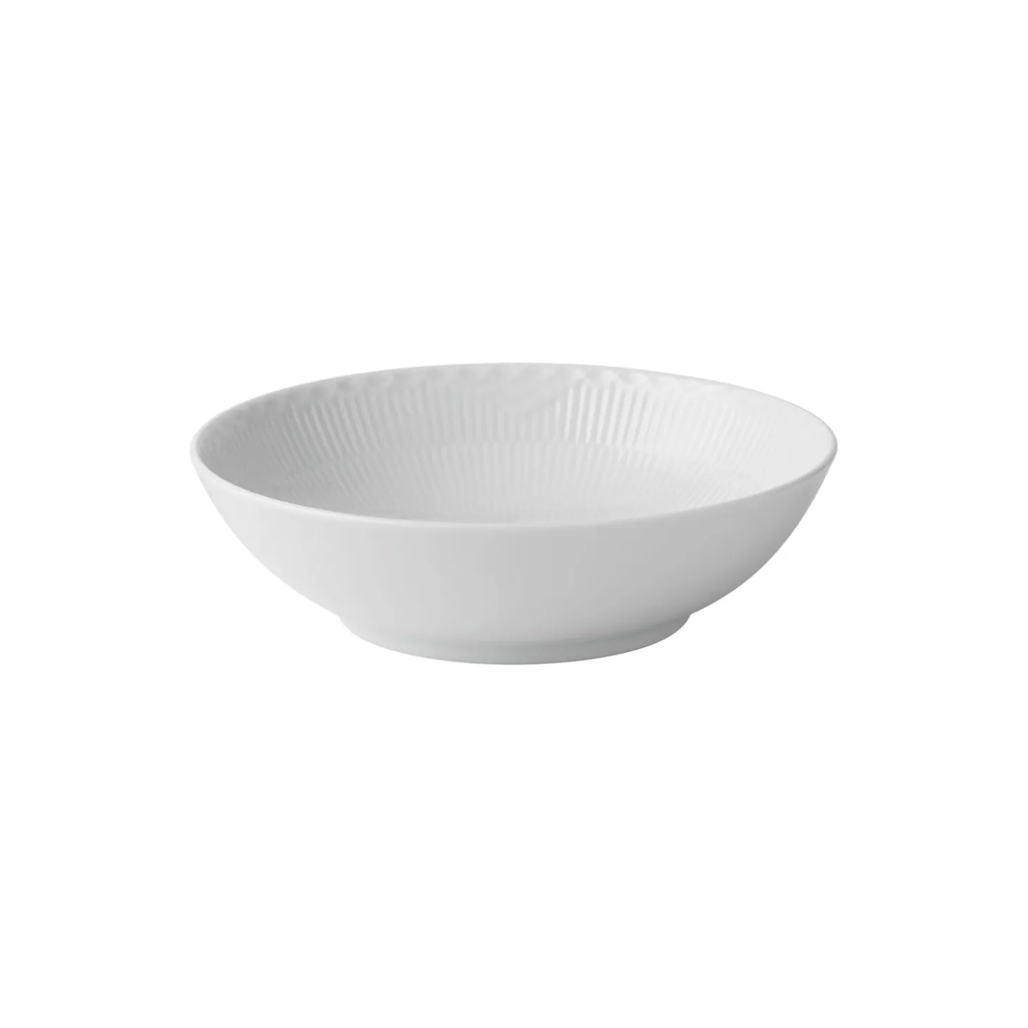 Hvid Halvblonde skål i porcelæn fra Royal Copenhagen. Ydersiden på denne Hvid Halvblonde Skål på 110 cl er holdt enkelt, mens skålens inderside prydes af en blondekant og rifler. Skålen kan både bruges som serveringsskål eller som skål til portionsanretninger af for eksempel isdesserter eller farverige salater.
