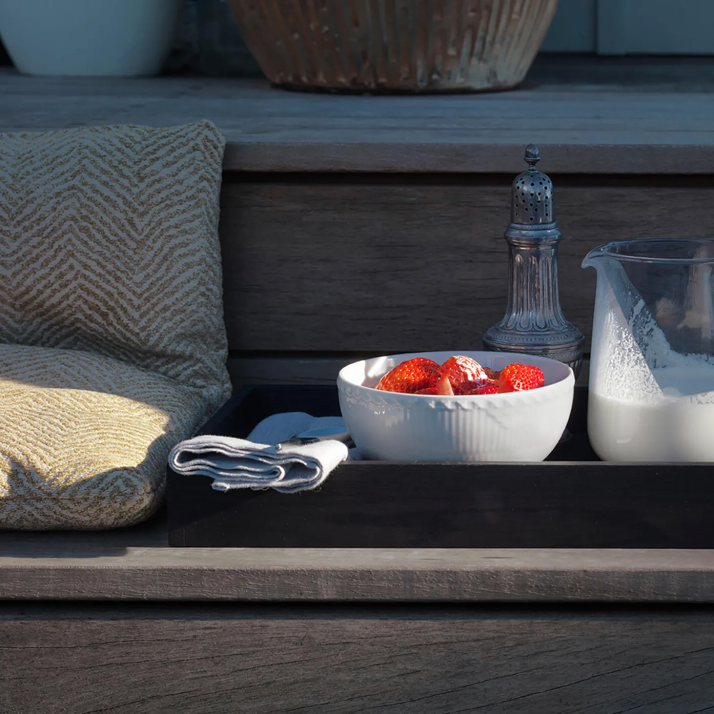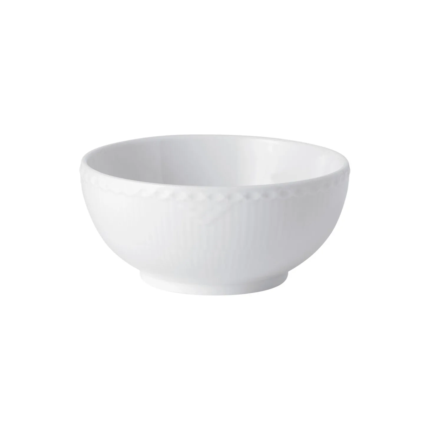 Hvid Halvblonde skål i porcelæn fra Royal Copenhagen. En lille Hvid Halvblonde Skål på 15 cm, der er ideel som serveringsskål til små serveringer eller som et dekorativt stilleben i hjemmet. Blondeborten langs porcelænsskålens kant skaber en elegant overgang til de taktile rifler, som smukt reflekterer lyset fra sine omgivelserne takket være den tynde glasur på porcelænet.