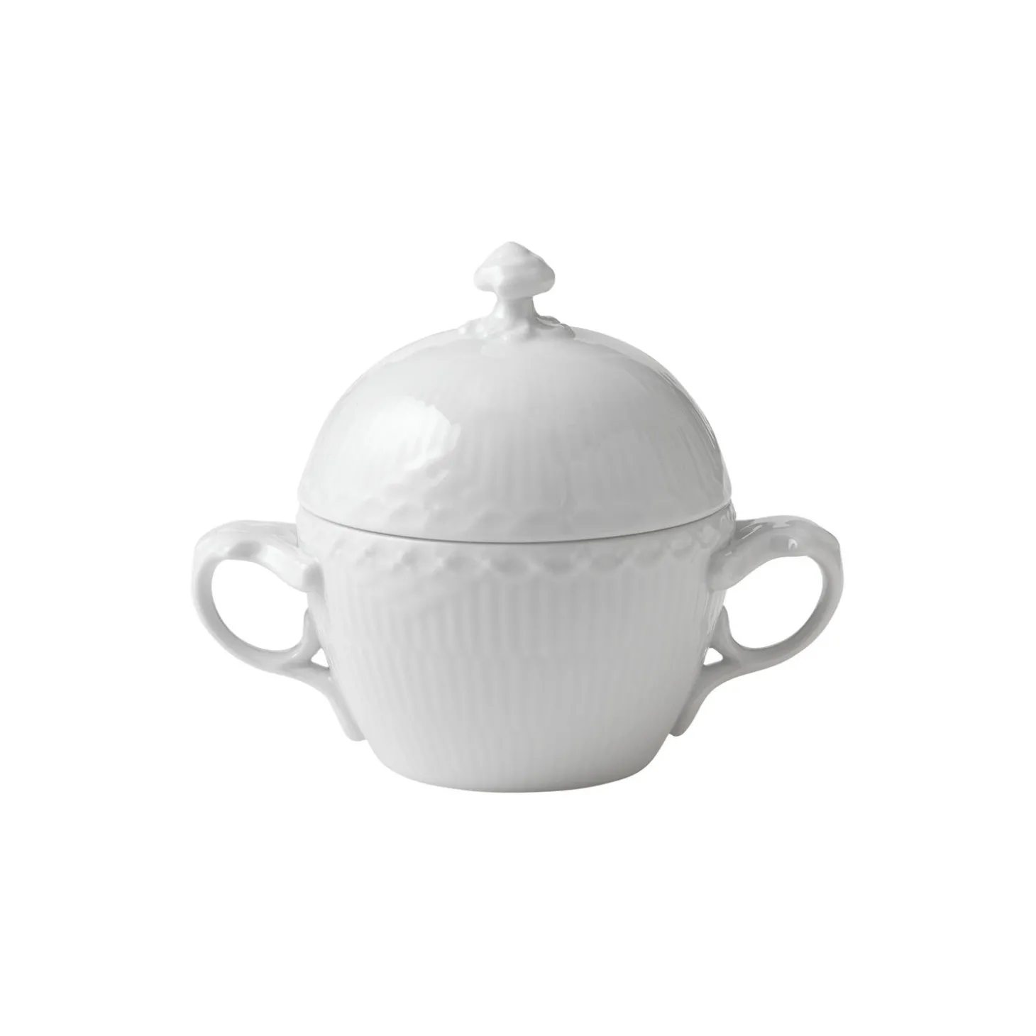 Hvid Halvblonde sukkerskål i porcelæn fra Royal Copenhagen. Den elegante symmetri skabt af de delikate hanke på denne bedårende Hvid Halvblonde Sukkerskål på 20 cl er indbegrebet af det klassiske stel, der kombinerer en enkel æstetik med et romantisk udtryk. Skålen prydes af to bånd af blonder, og på låget sidder et lille sneglehus, som er inspireret af det musselmalede stel.