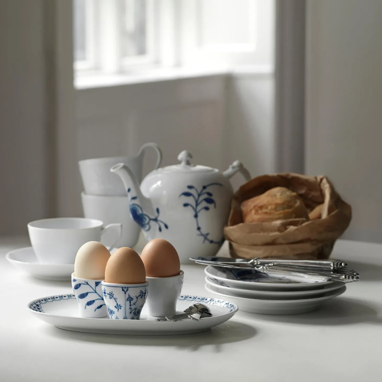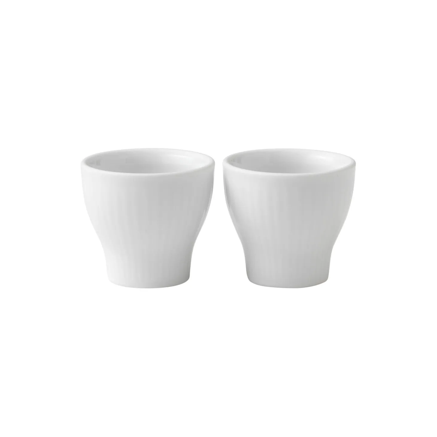 Hvid Riflet æggebæger i porcelæn fra Royal Copenhagen. Dette sæt af to æggebægre fra det tidløse Hvid Riflet-stel bliver hurtigt favoritter på morgenbordet, hvor det ubemalede, hvide porcelæn får modspil af æggets gule blomme. Æggebægrene passer til både store og små æg, og de kan også benyttes til krydderier eller små ejendele.